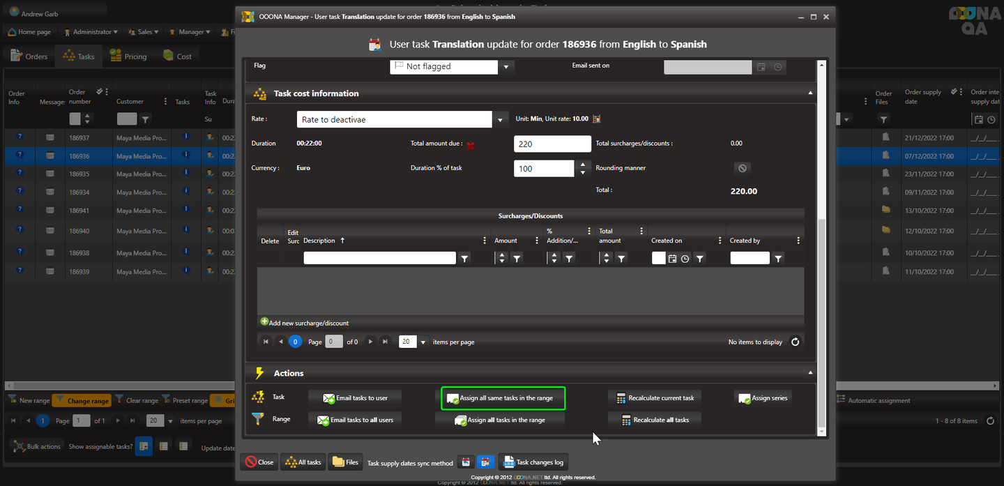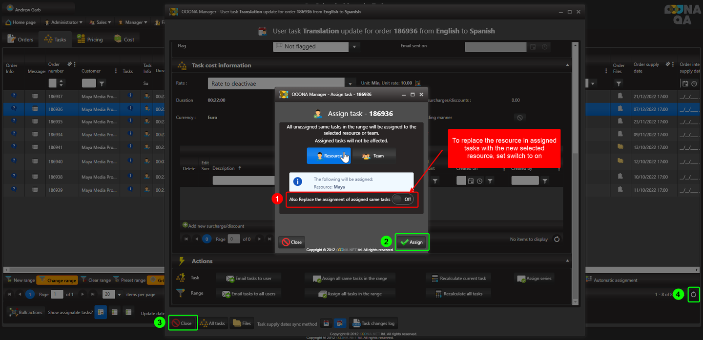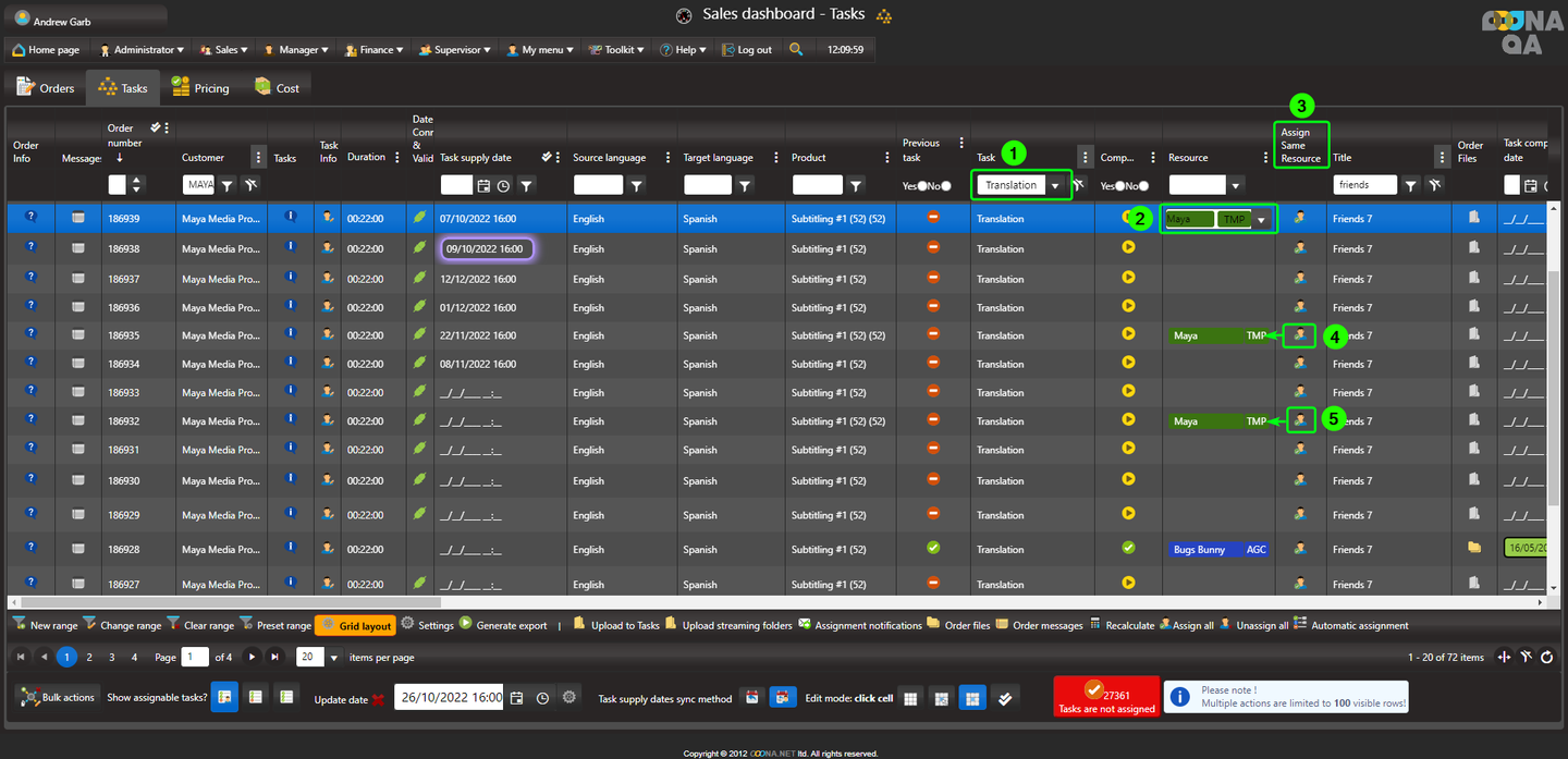 This tool will assign the same resource to all the same tasks in the order range (meaning all pages), and not only on the current page as the “Assign all” tool that was introduced in the previous example.