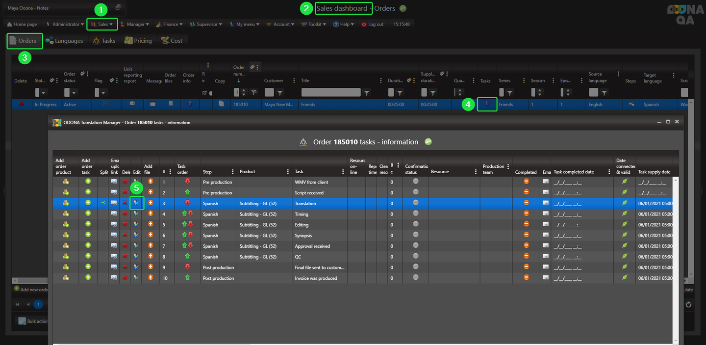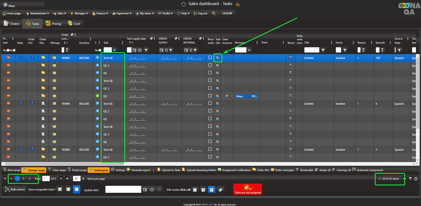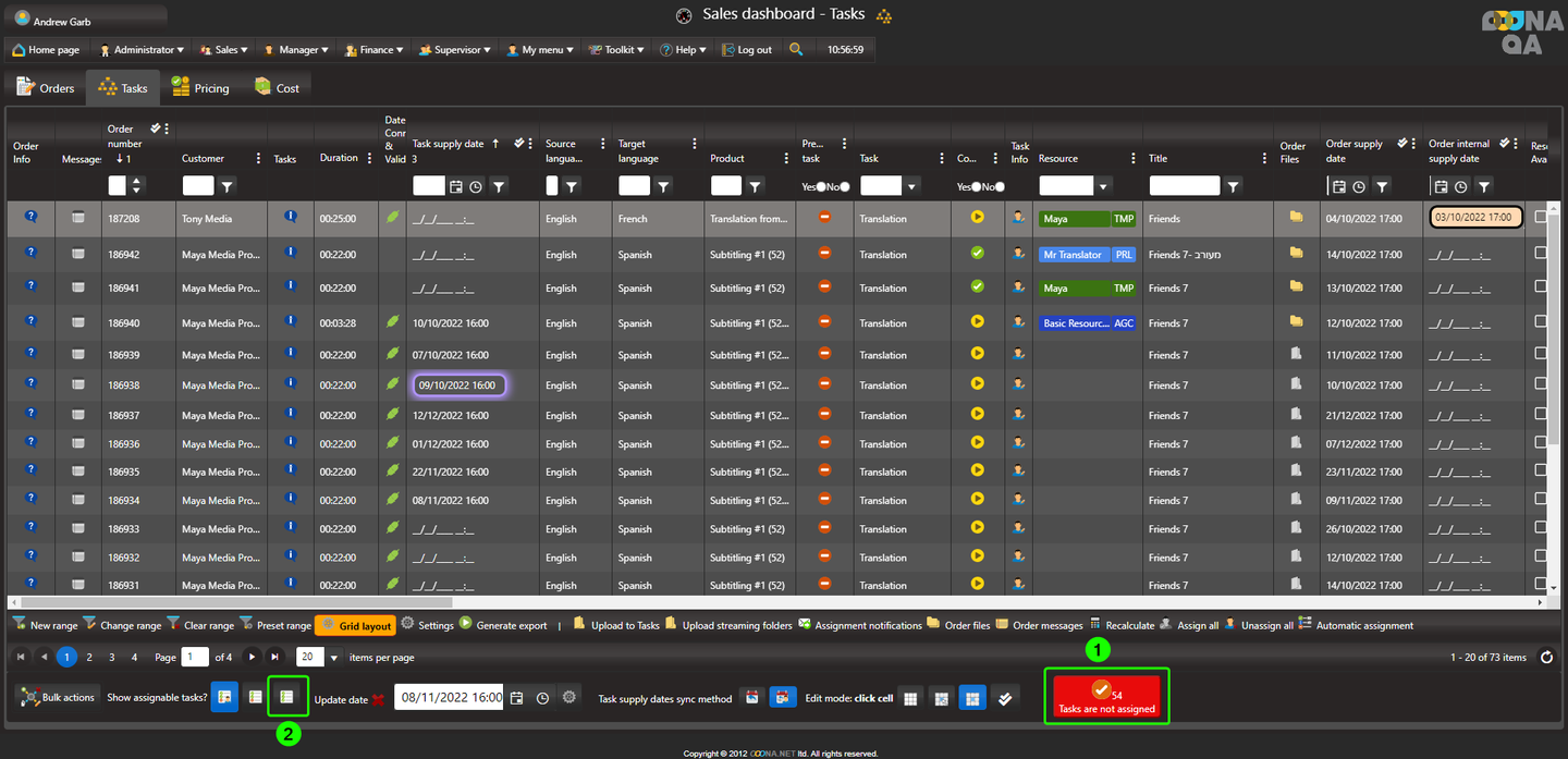 The “Tasks” page displays all the tasks within the orders range. Each line is one task (as opposed to the “Orders” page in which each line is one order).