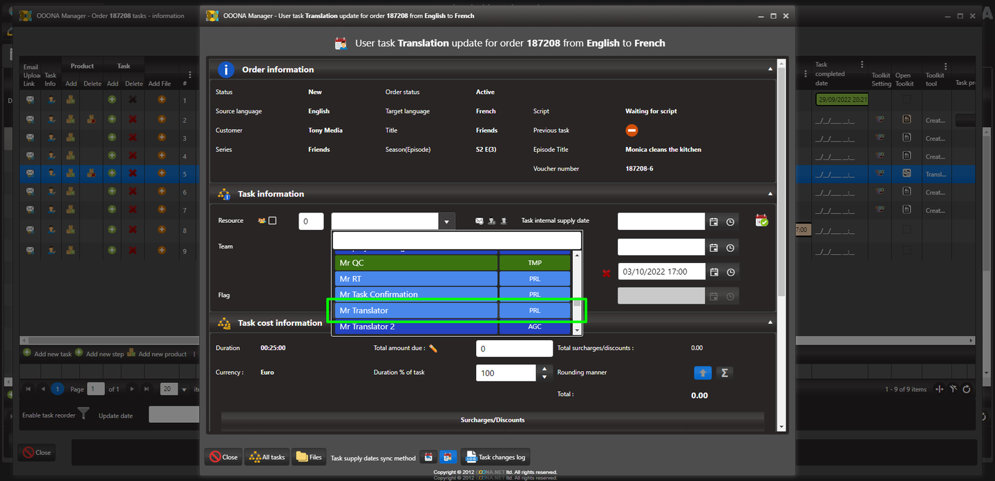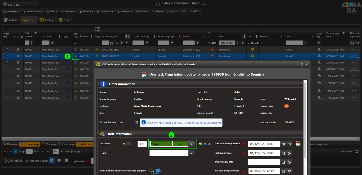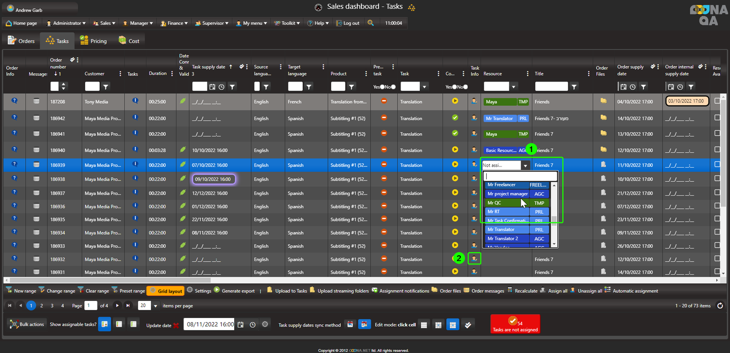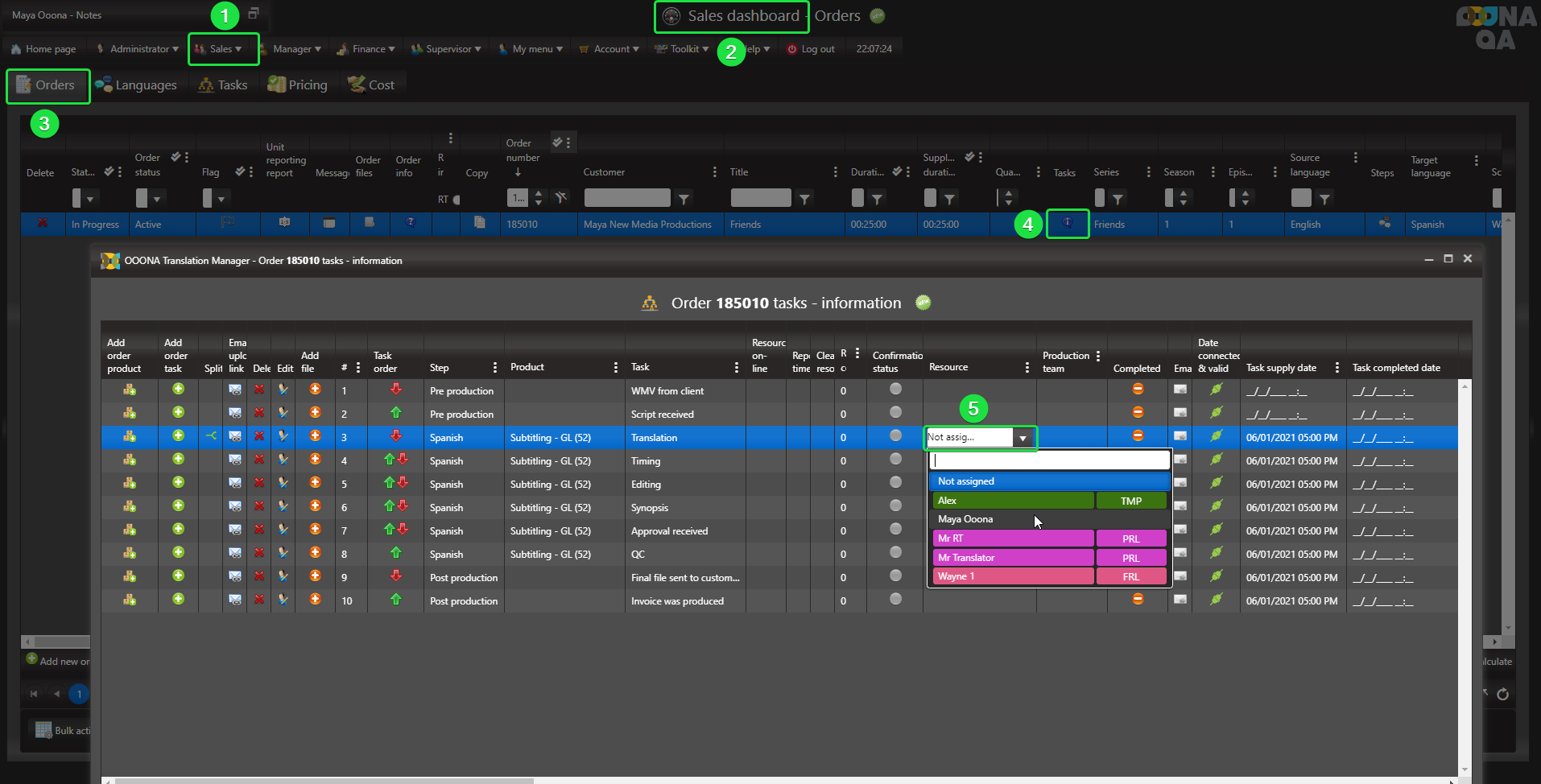 Note: if you don’t have the “Sales” menu, you can also assign from: Supervisor > Resource allocation to task (this page contains slightly fewer options).