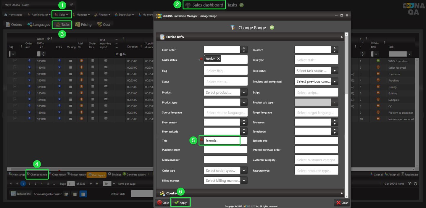 In the “Tasks” page, click the “Change range” button (fig 4) and create a range to display the orders you want to assign. You can filter the range by any value you find suitable: order number, title, series, etc. (fig 5).