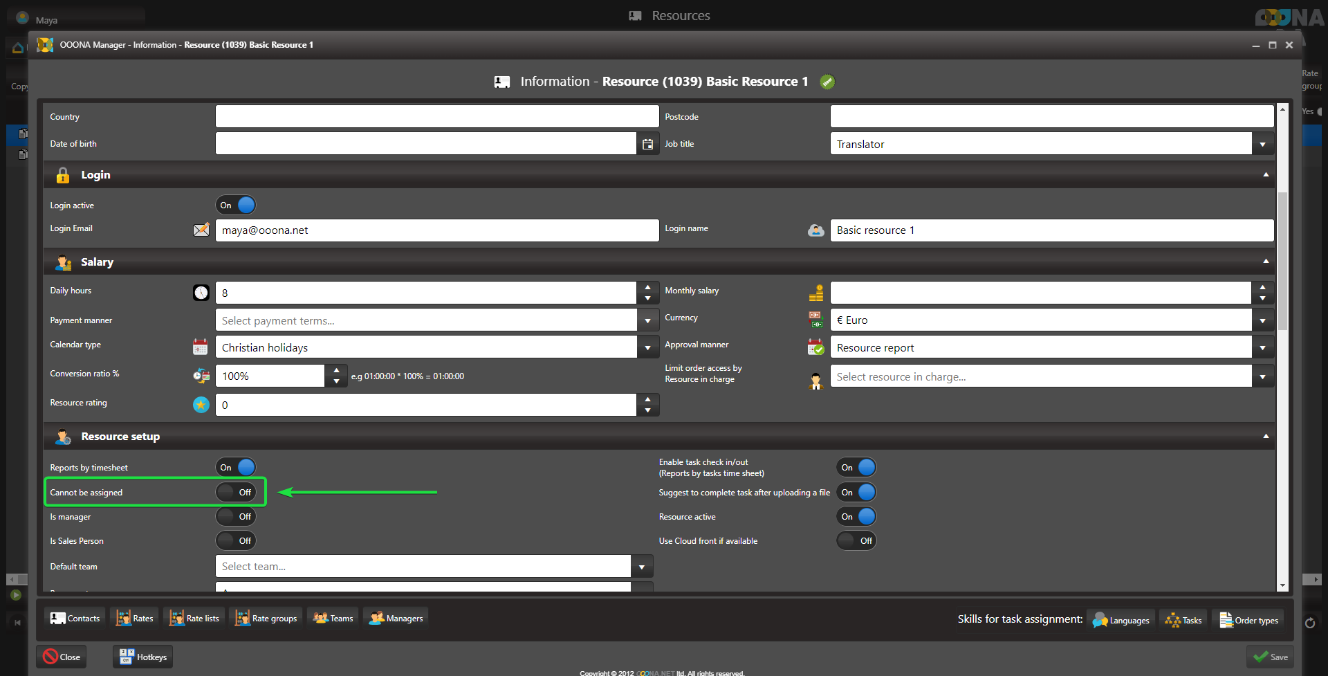 When this toggle is off, the resource cannot be assigned to tasks, even if his resource skills are correctly set.