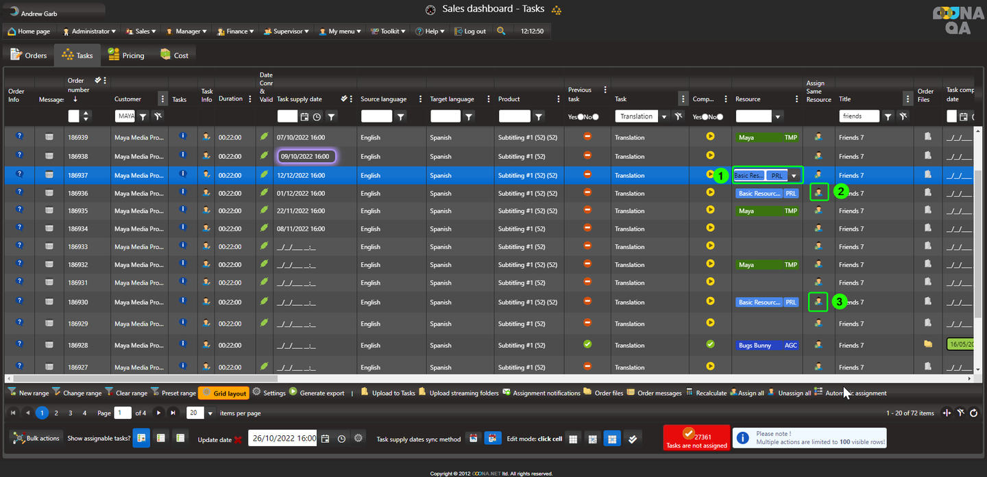 The advantage of assigning multiple orders from the “Tasks” page is that each line is one task from the range which makes it easy to quickly assign resources, one by one, to the different tasks.