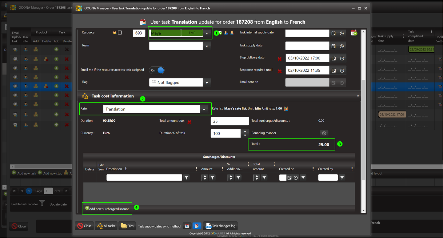 Assigning from the “Task Edit” page has some advantages over the quick in-line assigning. You can see and change the resource rate that was applied for the task, add surcharges and perform additional actions.