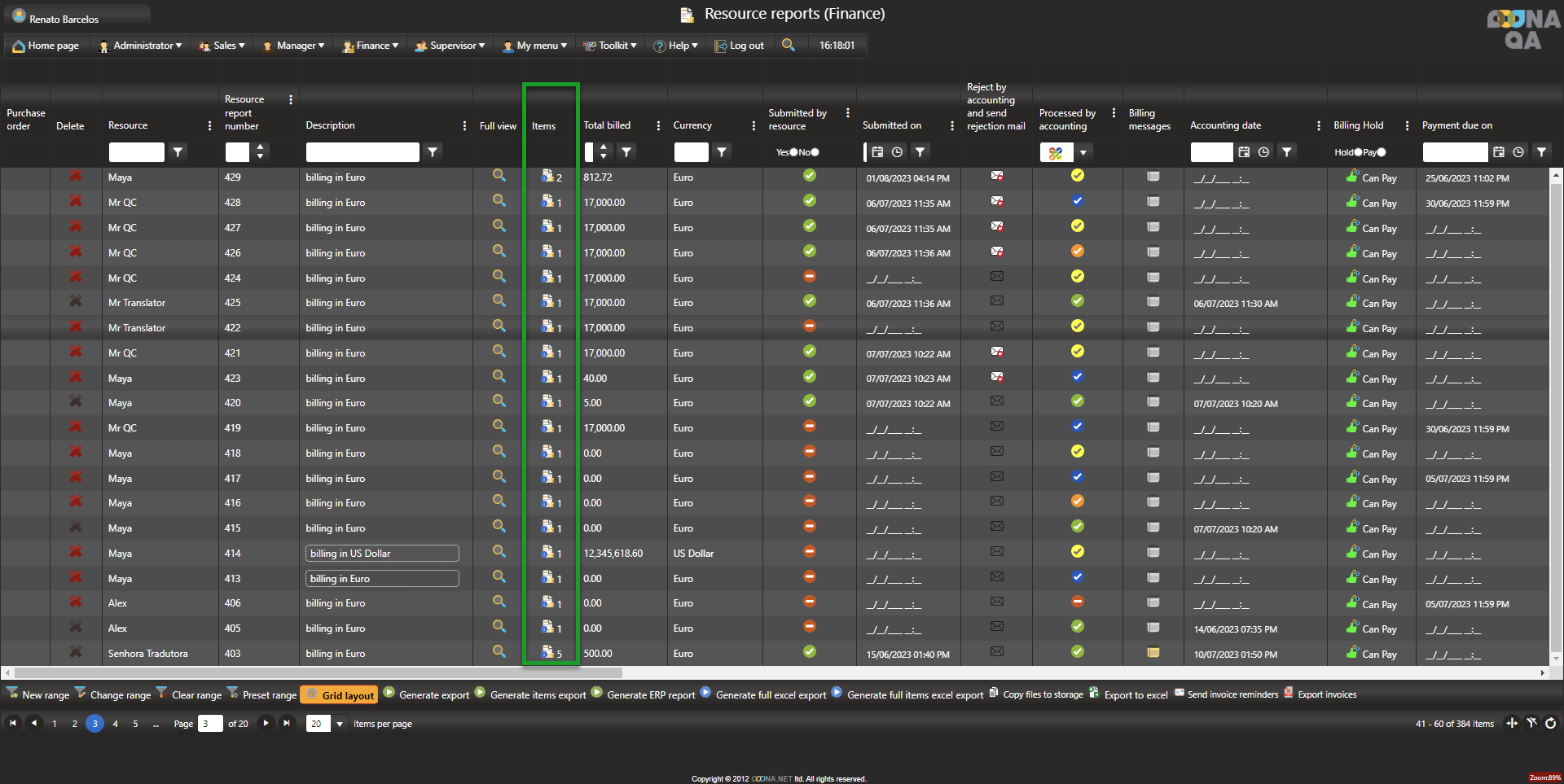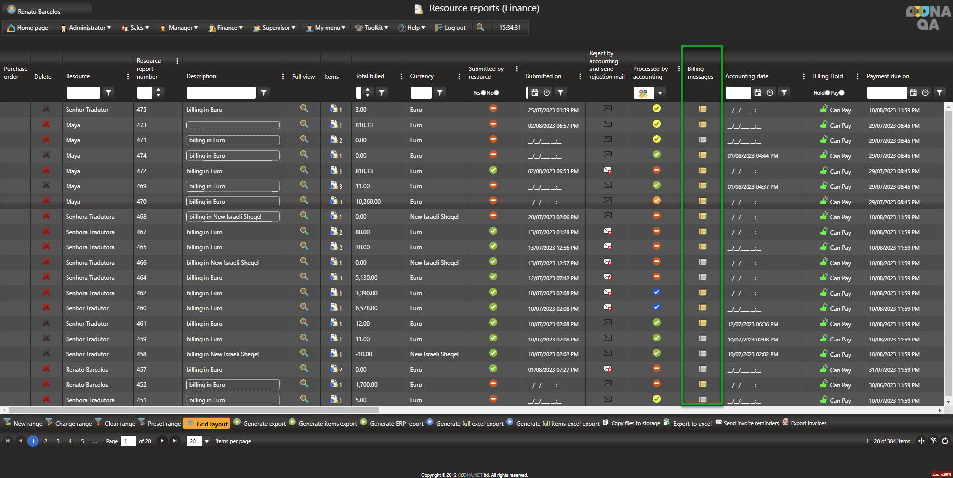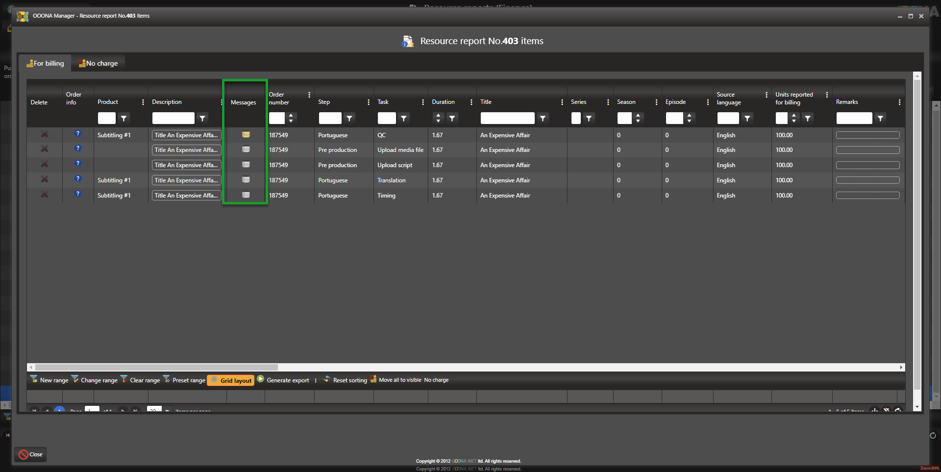 Item messages - displayed below resource report messages. They include info on which order, language, product and task they refer to