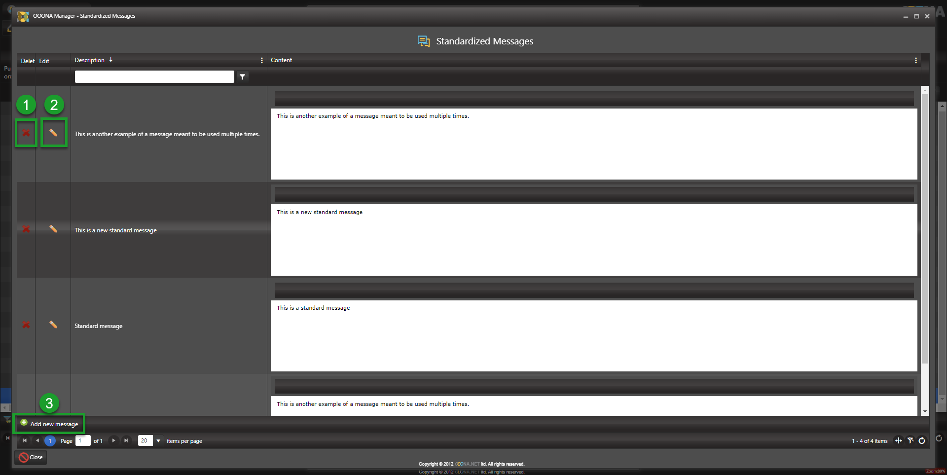 In this page, messages can be deleted (1), edited (2) and new ones can be added (3).