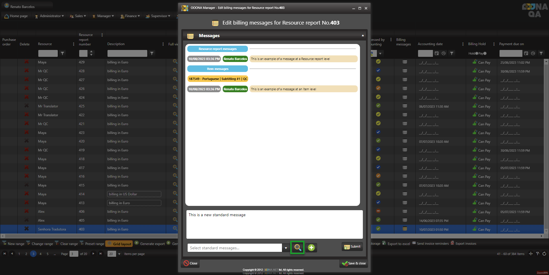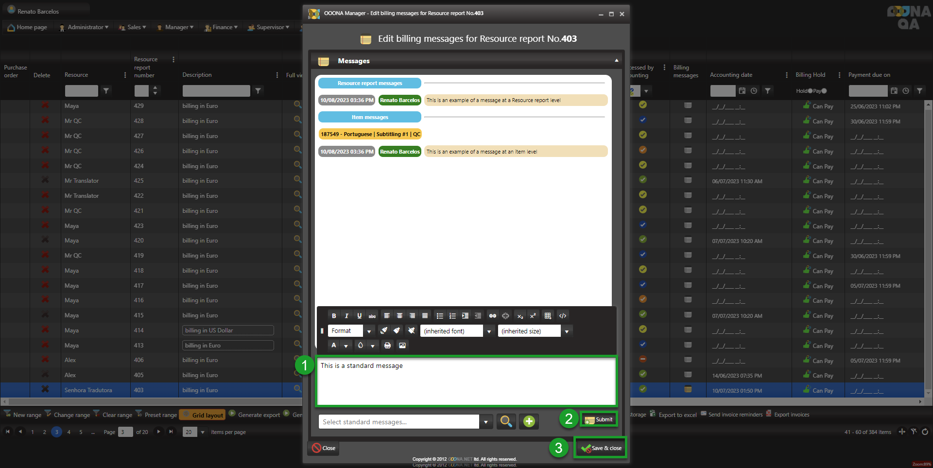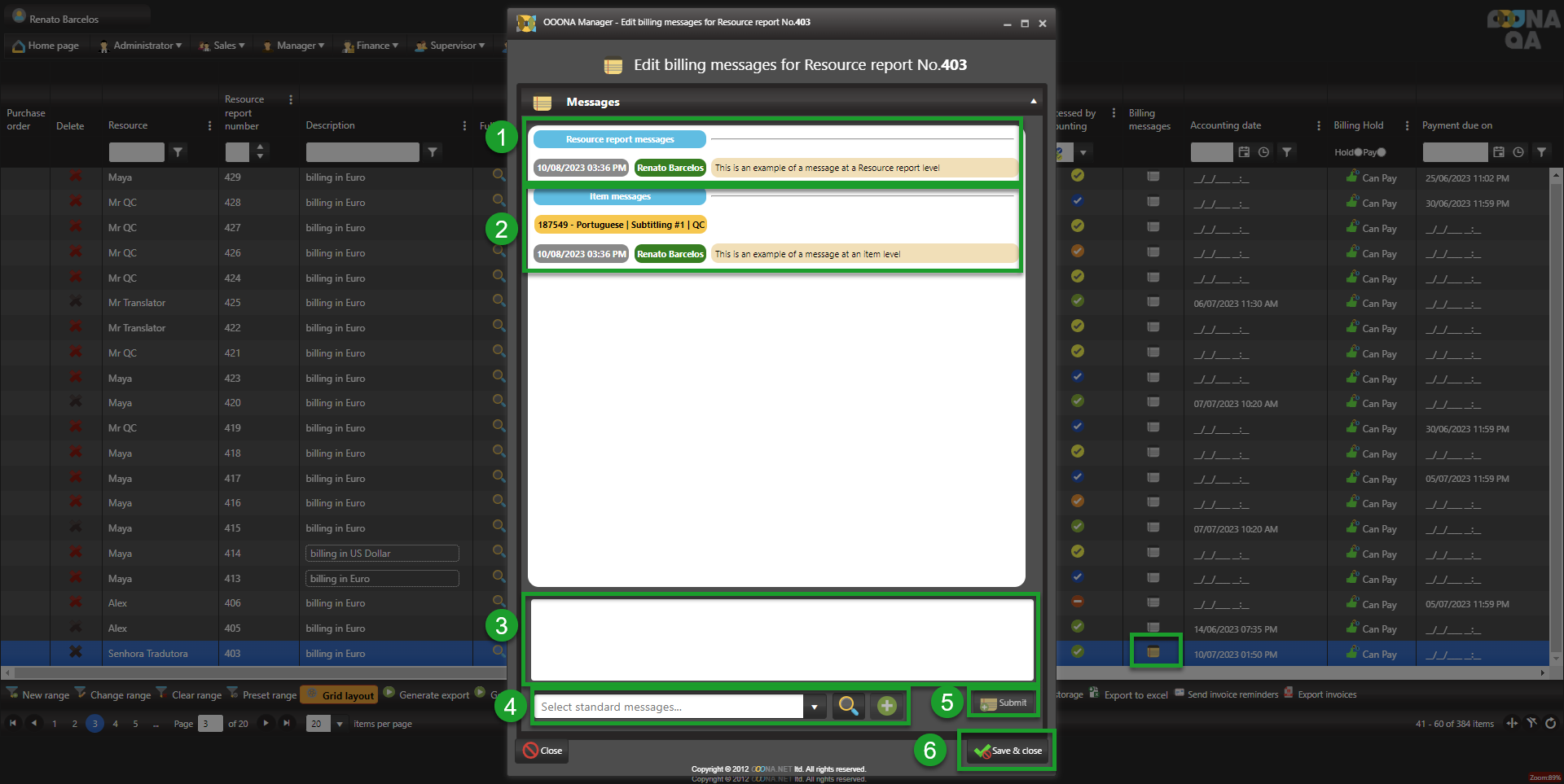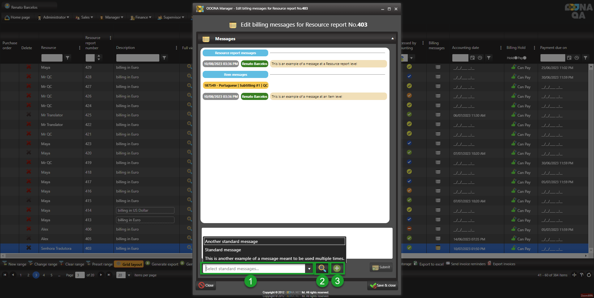 As part of the Resource reports feature, it is possible to add messages pertaining to a specific report or an item within a report.