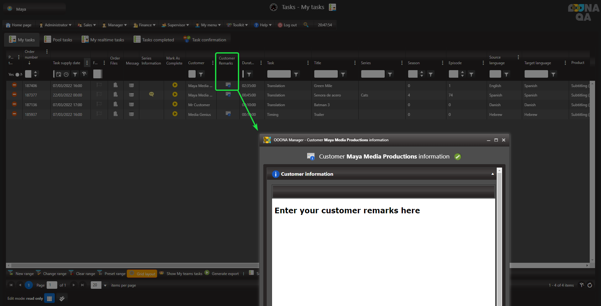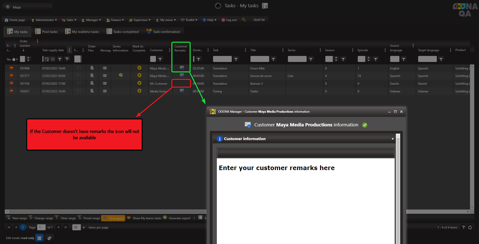 The customer remarks can be viewed from the following basic user pages, by users with the required role: