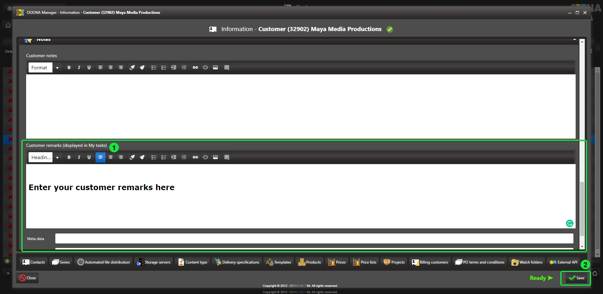 Customer remarks can be used to add permanent remarks, guidelines, etc, to the Customer record.