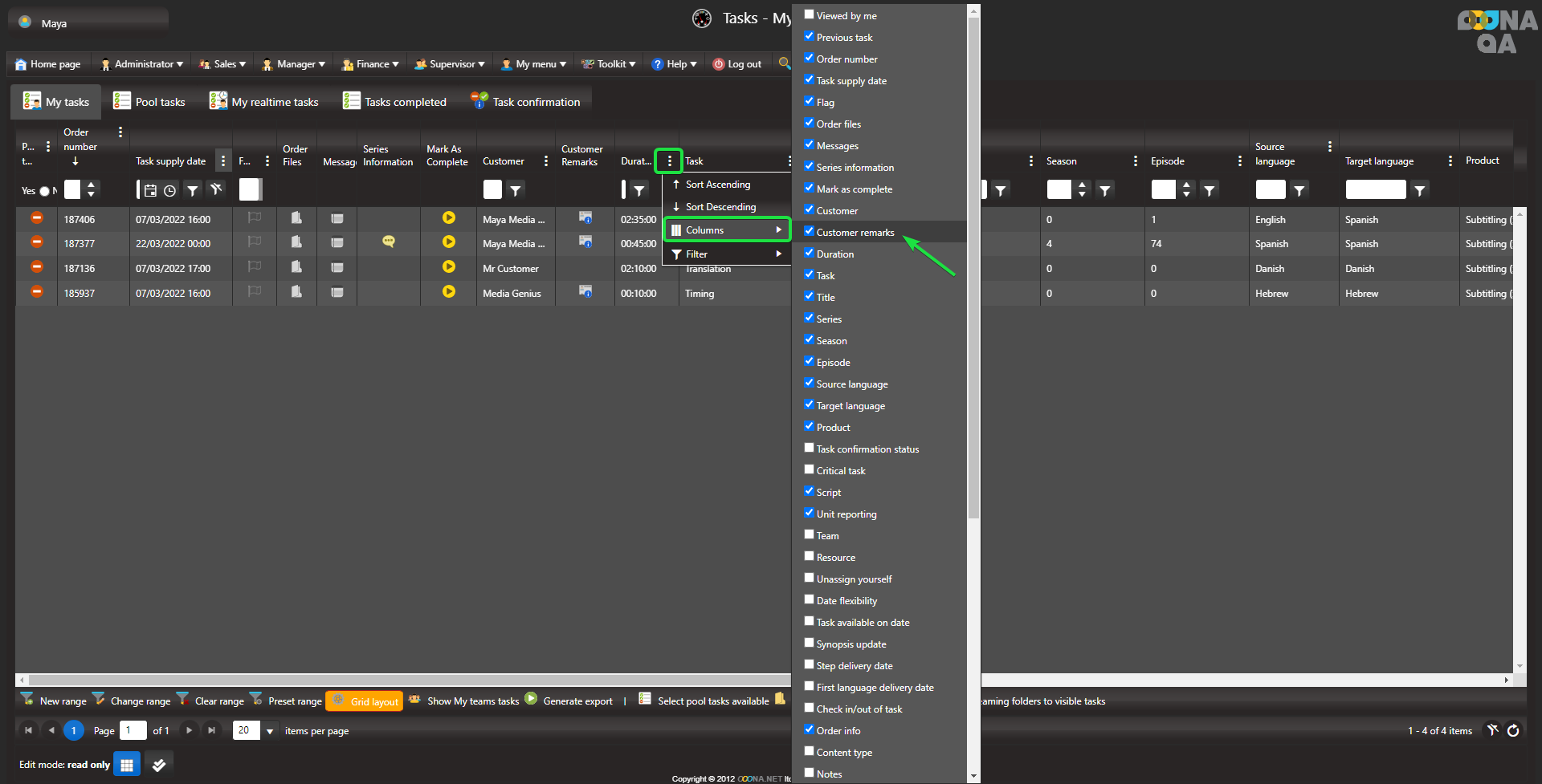 If you have the required role and you don’t see the Customer remarks column, check if it’s enabled in your grid.