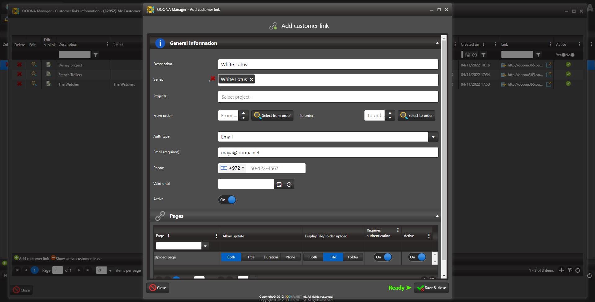 File upload links can be sent to your customer so he can independently upload assets (media files and DRM folders) to tasks.