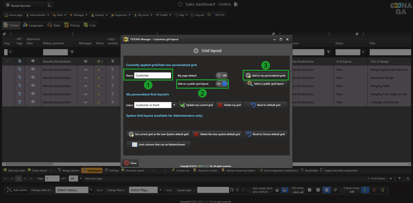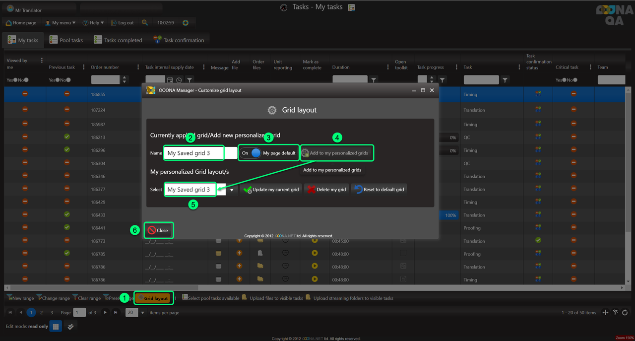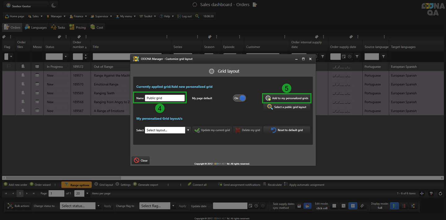 To save the grid or any changes done to it, it needs to be added to the personalized grid of the user by adding a name (4) and adding it to the selection (5).