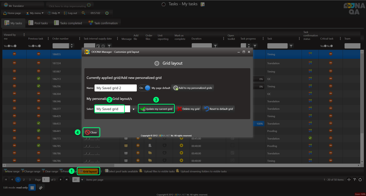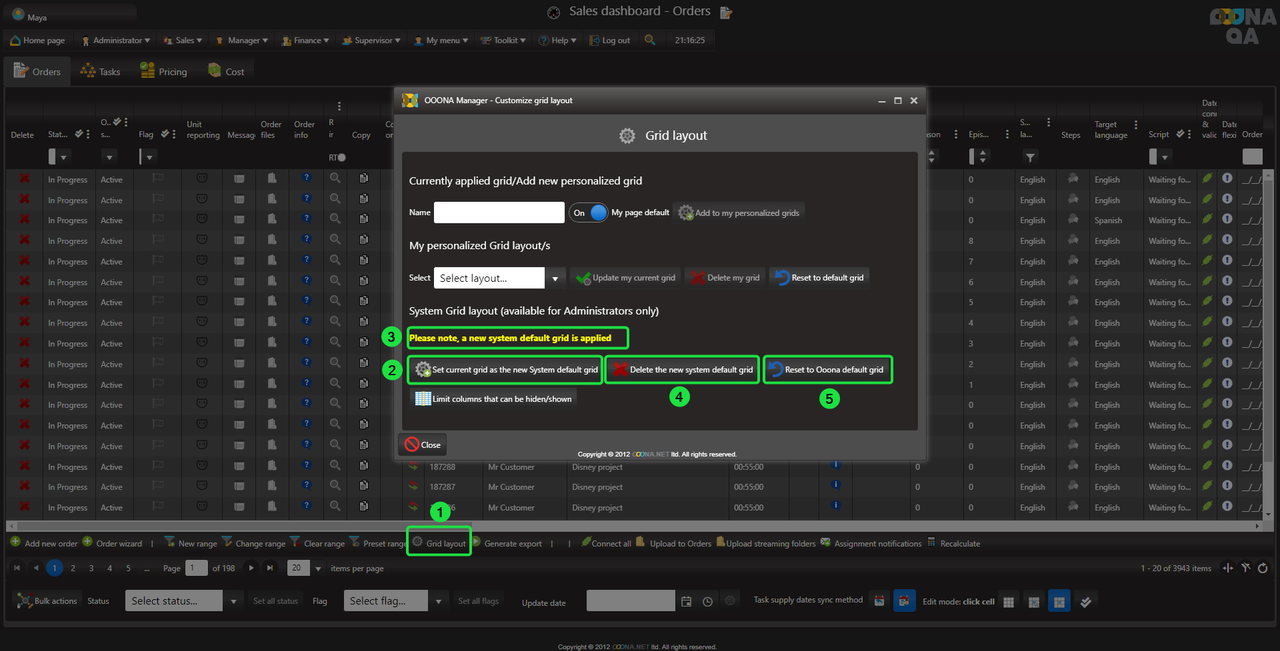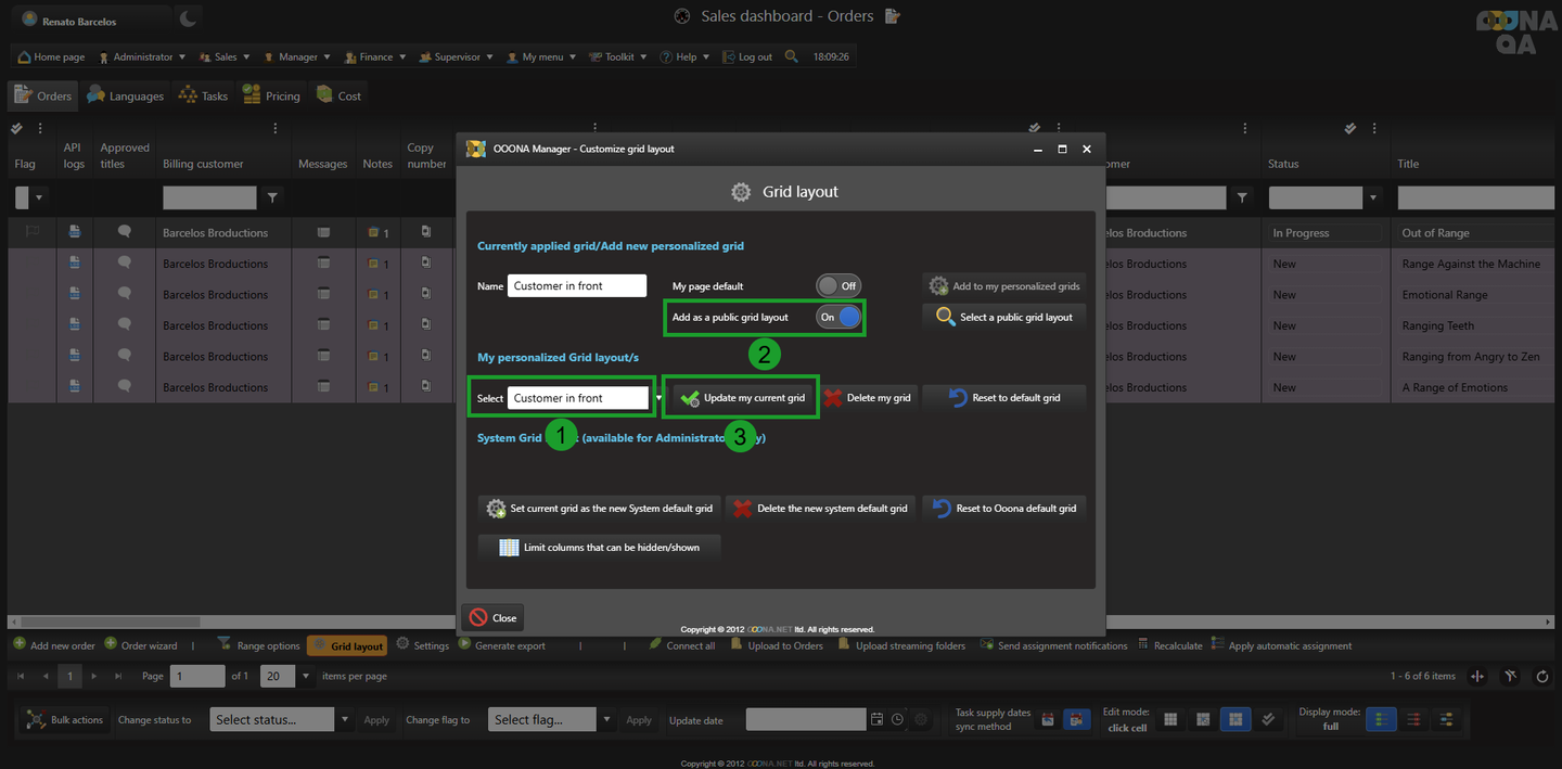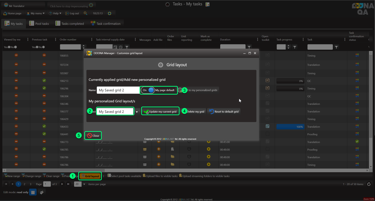 To save the grid or any changes done to it, it needs to be added to the personalized grid of the user by adding a name (4) and adding it to the selection (5).