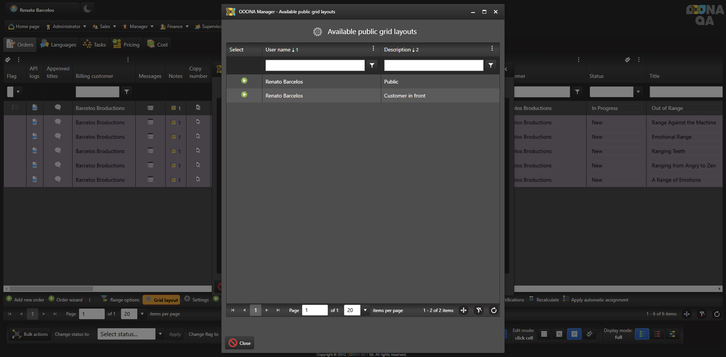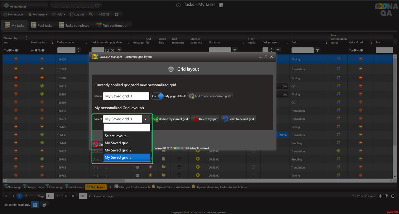 On all OOONA manager pages, the grid layout is customizable, allowing you to show, hide, re-position or change the width of the columns according to your preferences.