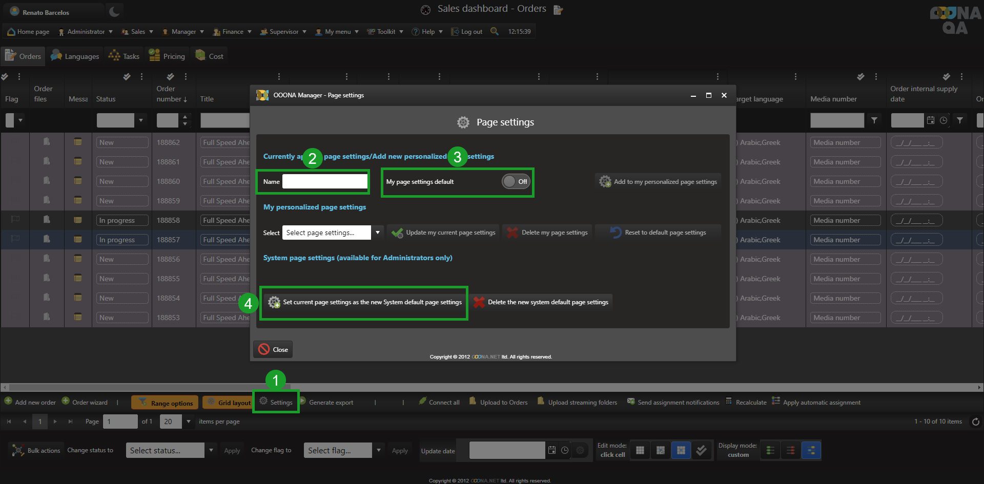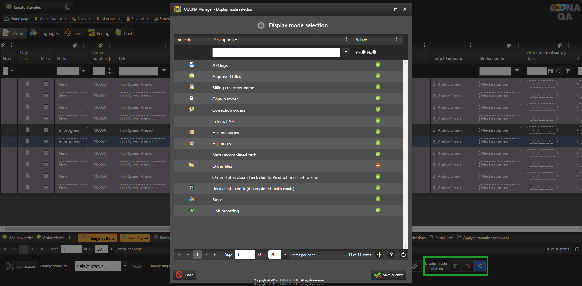 The display mode is a new option added to the Sales dashboard (Orders, Languages and Tasks tabs) that enables the speed of the page to be improved by reducing the amount of live data the system loads when using these pages.