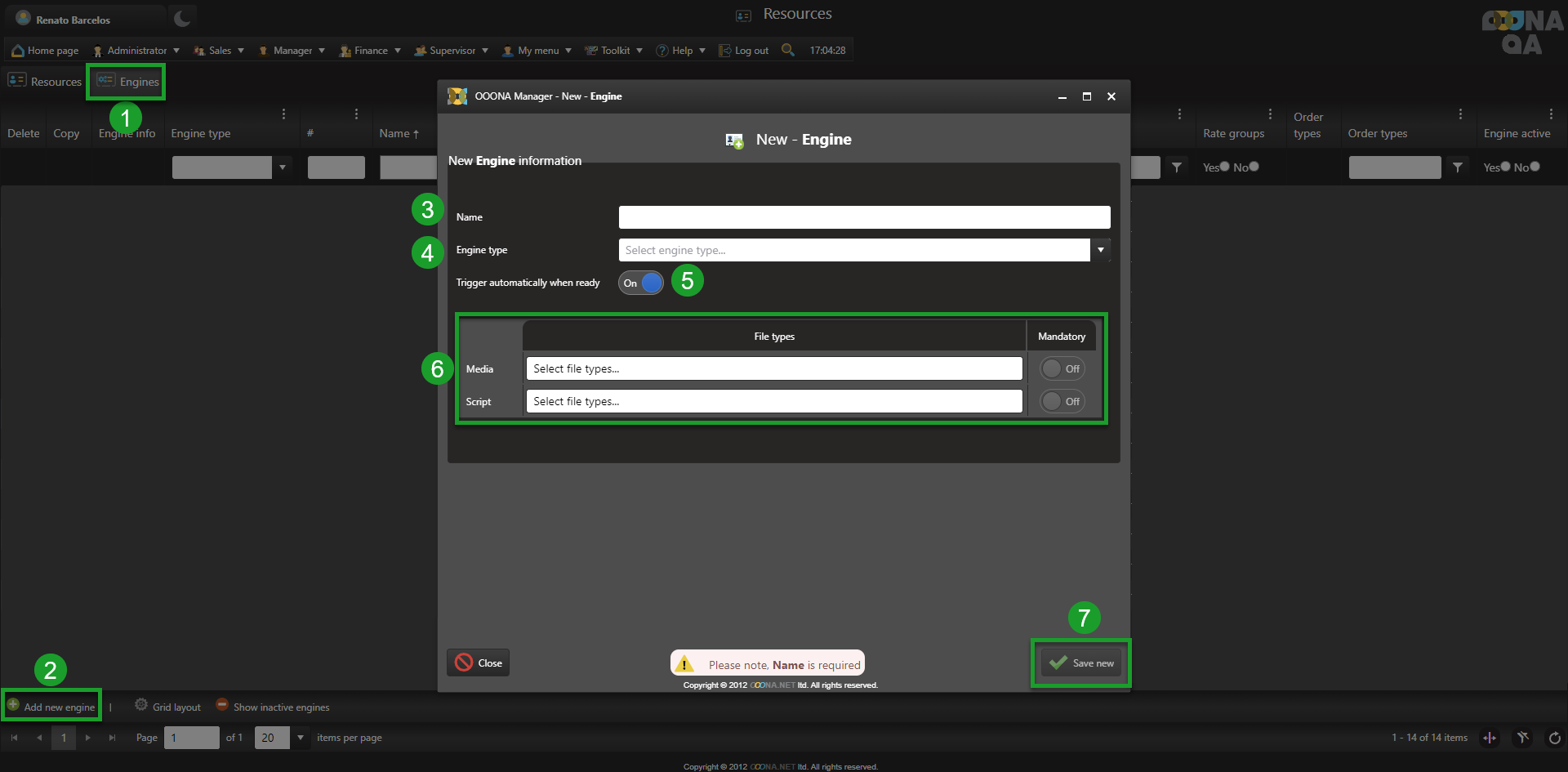 Engines are available in the system as resources and can be created from Manager > Rolodex tables > Resources.