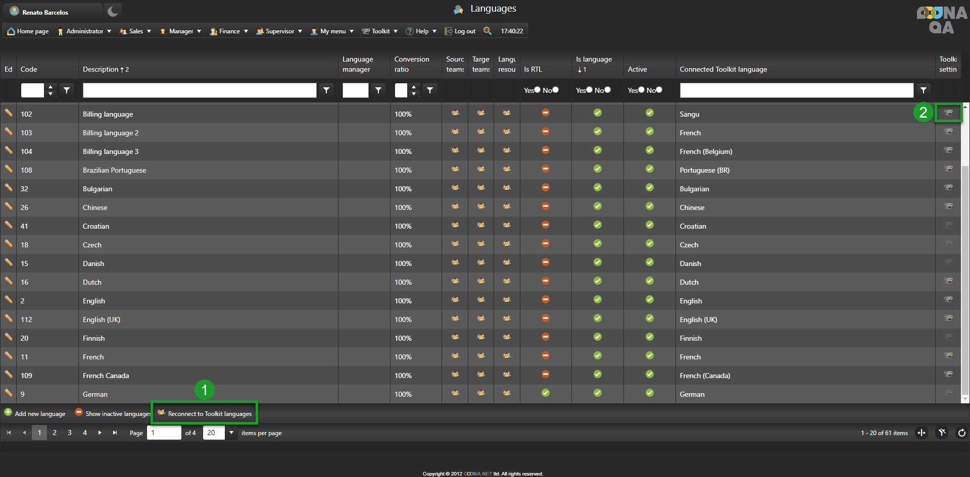 Using “Reconnect to Toolkit languages” (1), the system will try to populate the “Connected Toolkit language” column based on that language’s Toolkit settings.