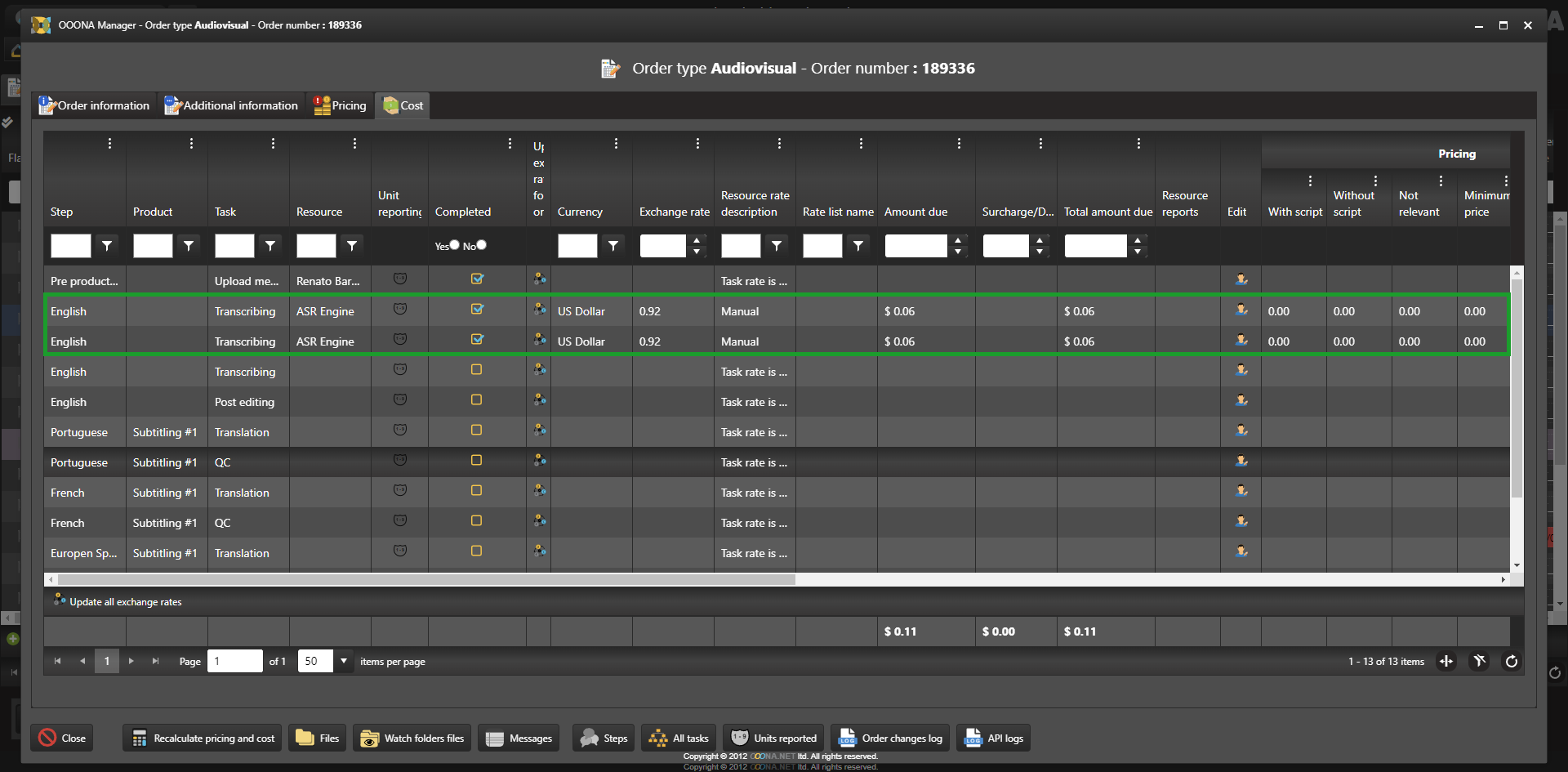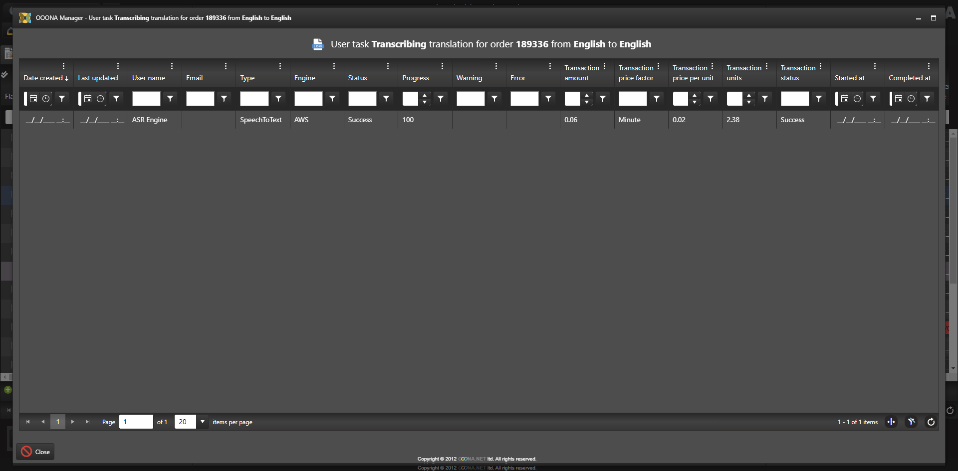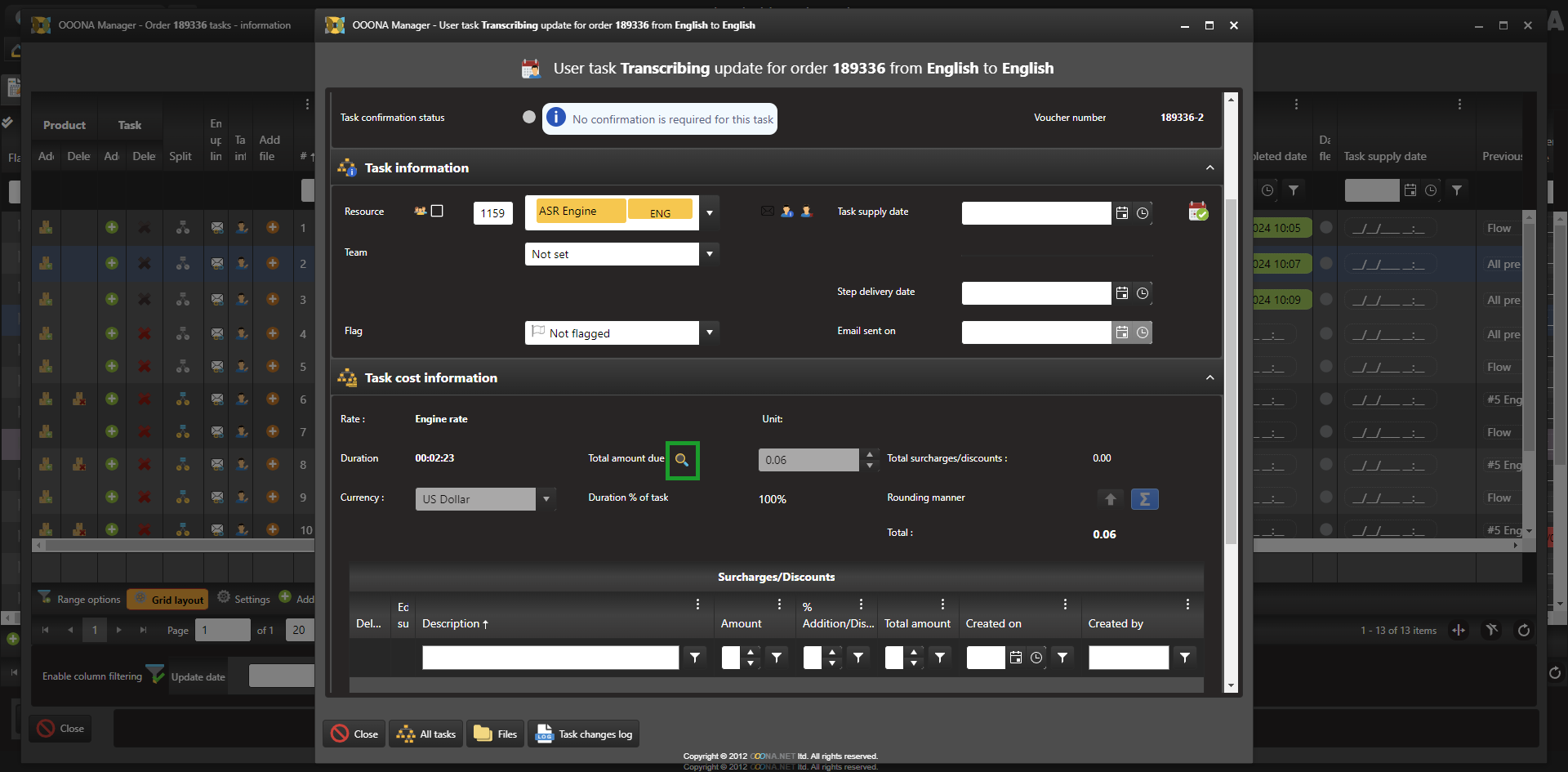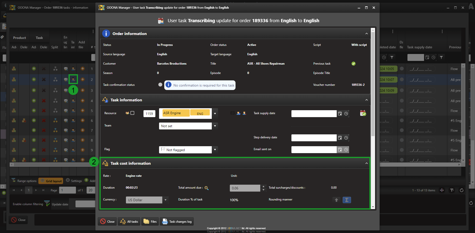 After an engine has processed a task, the cost information is added to the Task info page (1) of the task the engine was assigned to, in the “Task cost information” section (2):