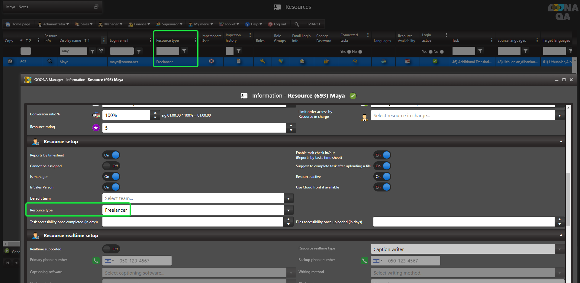The resource type is set from the Resource info page: