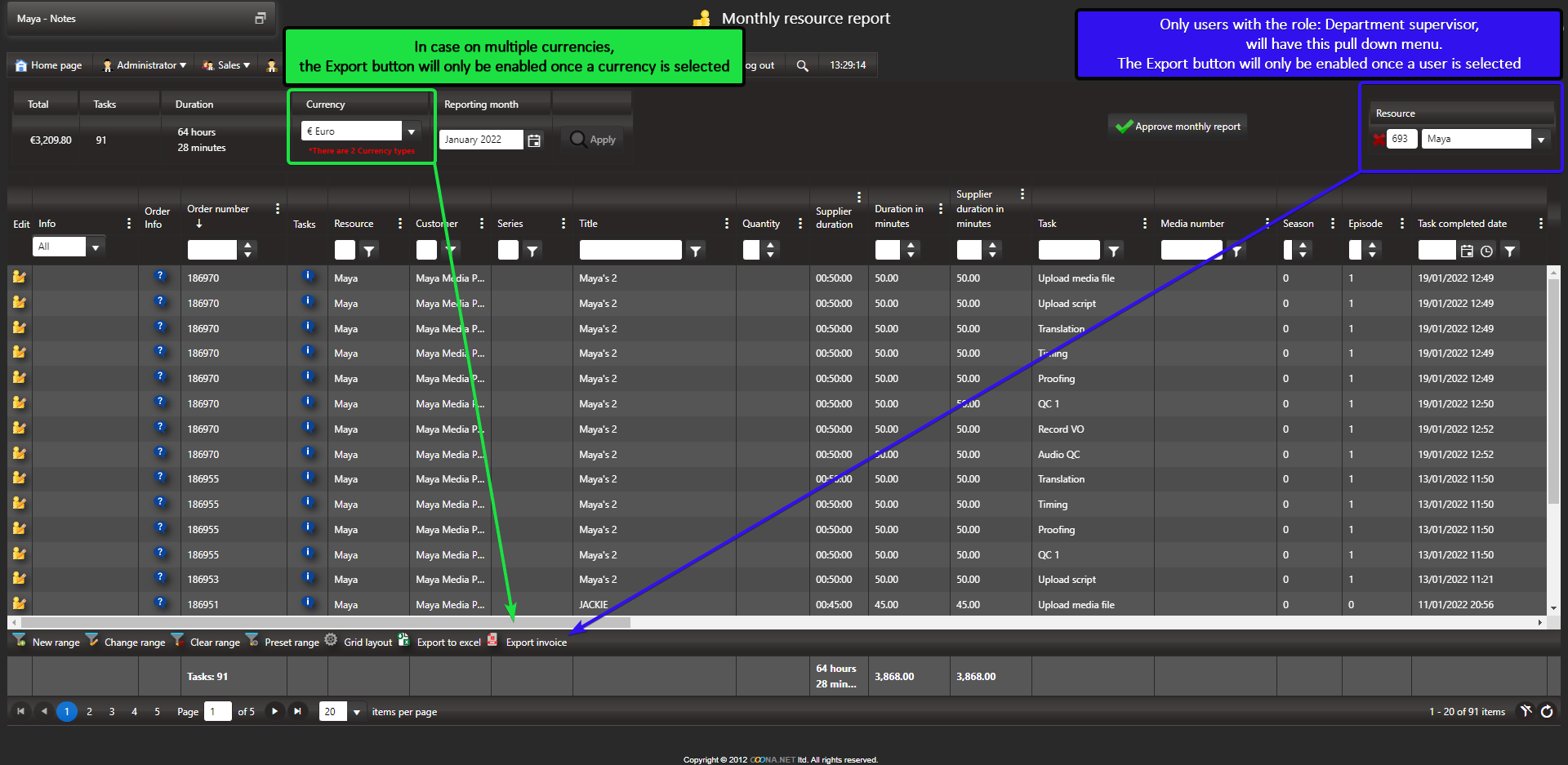 Users with the role: Department supervisor, can export invoices for other resources even if their own resource type doesn’t enable it