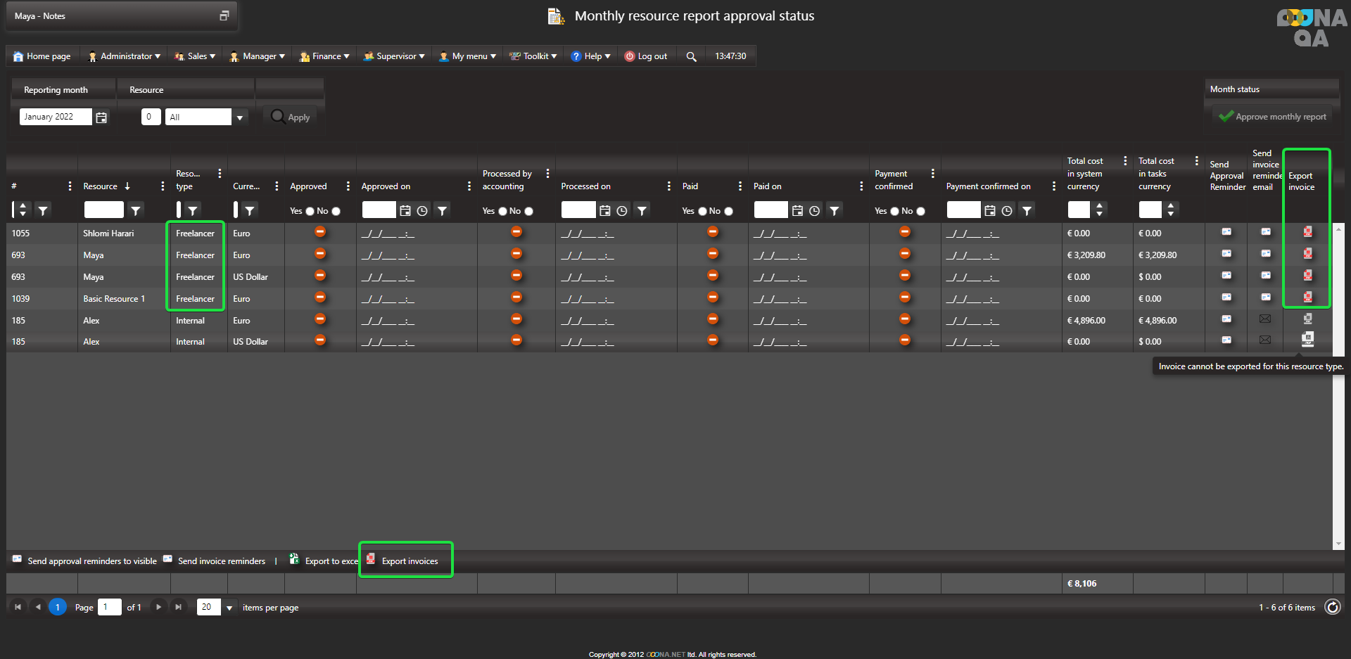 If the resource is getting paid in more than one currency in a certain month, a separate invoice has to be exported for each currency