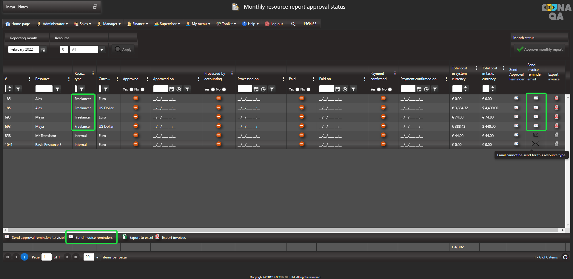 Managers can send enabled resources reminders to send their monthly invoices.