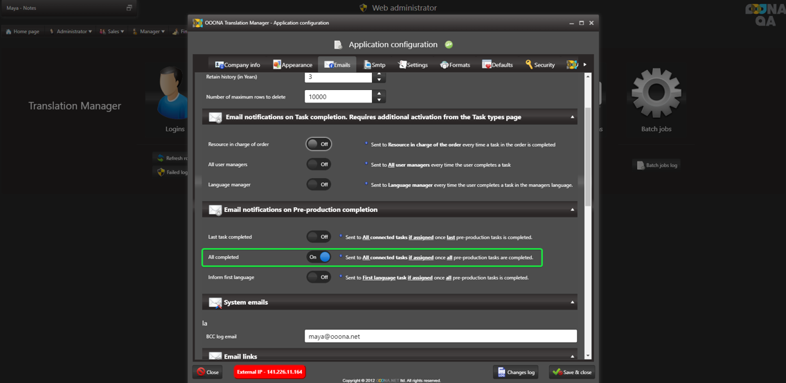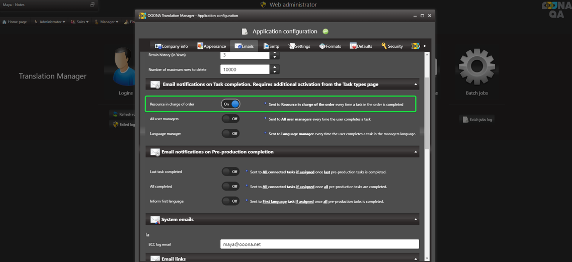 Set export configuration of the project/s from Toolkit into the Order in OOONA Manager