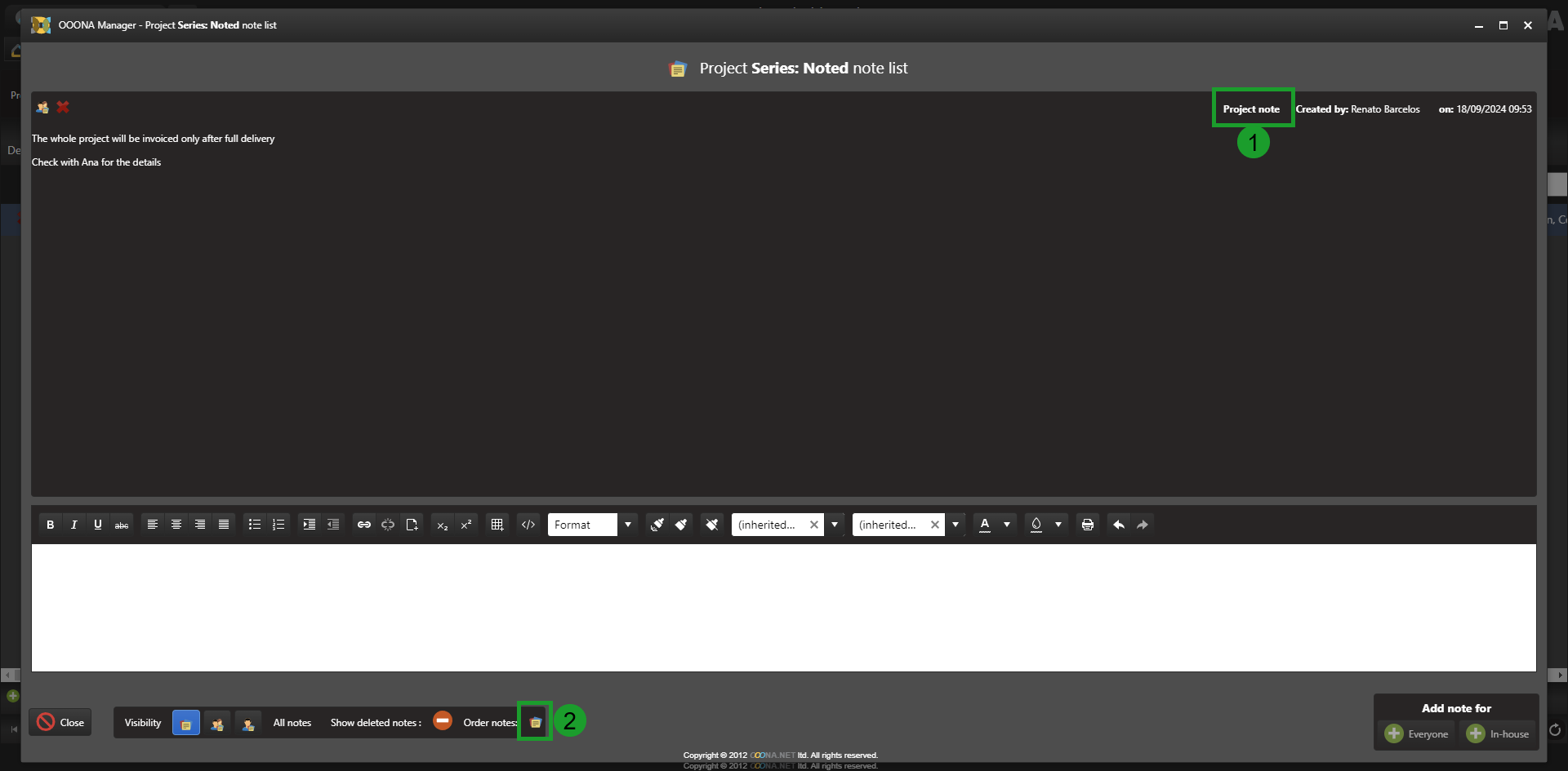 It’s also possible to access a list of all notes from orders within the project, from the “Order notes” page (2).