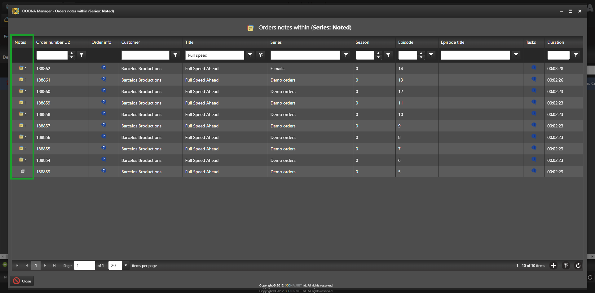 The Order notes page will show all orders within the project, showing orders with notes first by default: