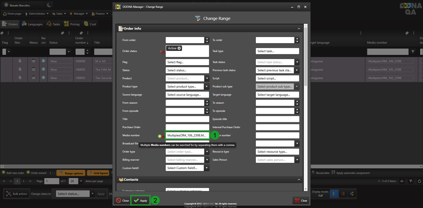 After adding the required media numbers, the list of orders containing them will be shown below (3).