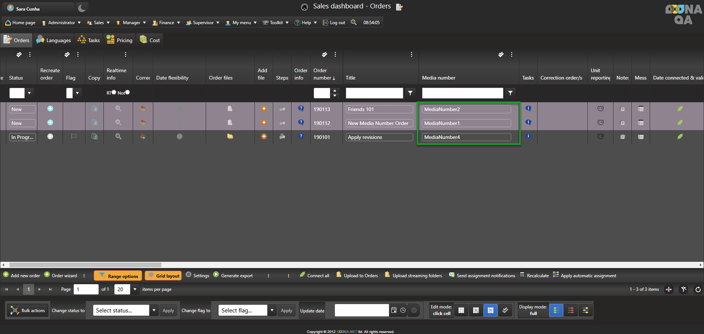 After adding the required media numbers, they will be listed in the grid below (3). If there are no orders with the selected media numbers, an order can be added by clicking the icon in the “Add order” column (4).