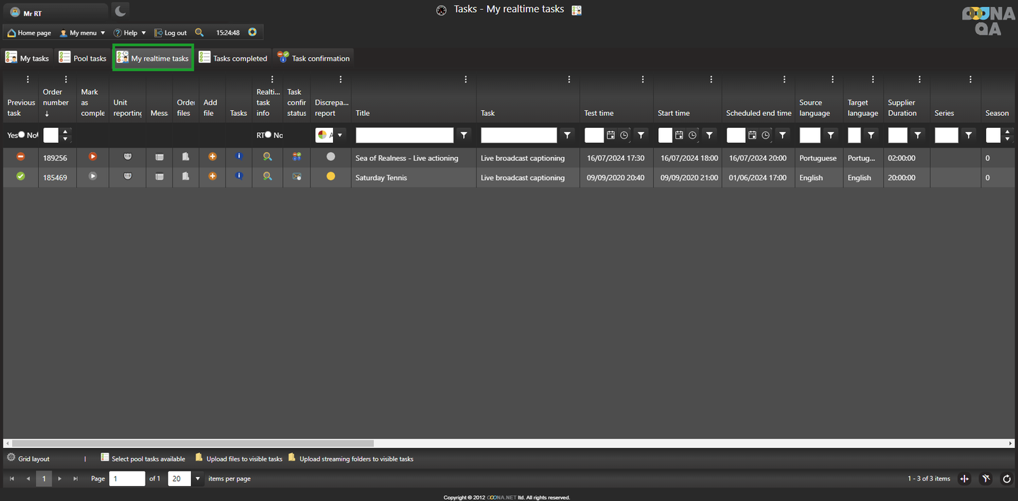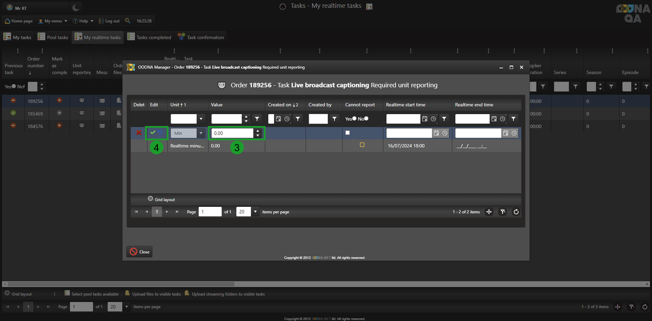 Realtime tasks can be completed using the “Mark as complete” column (1):