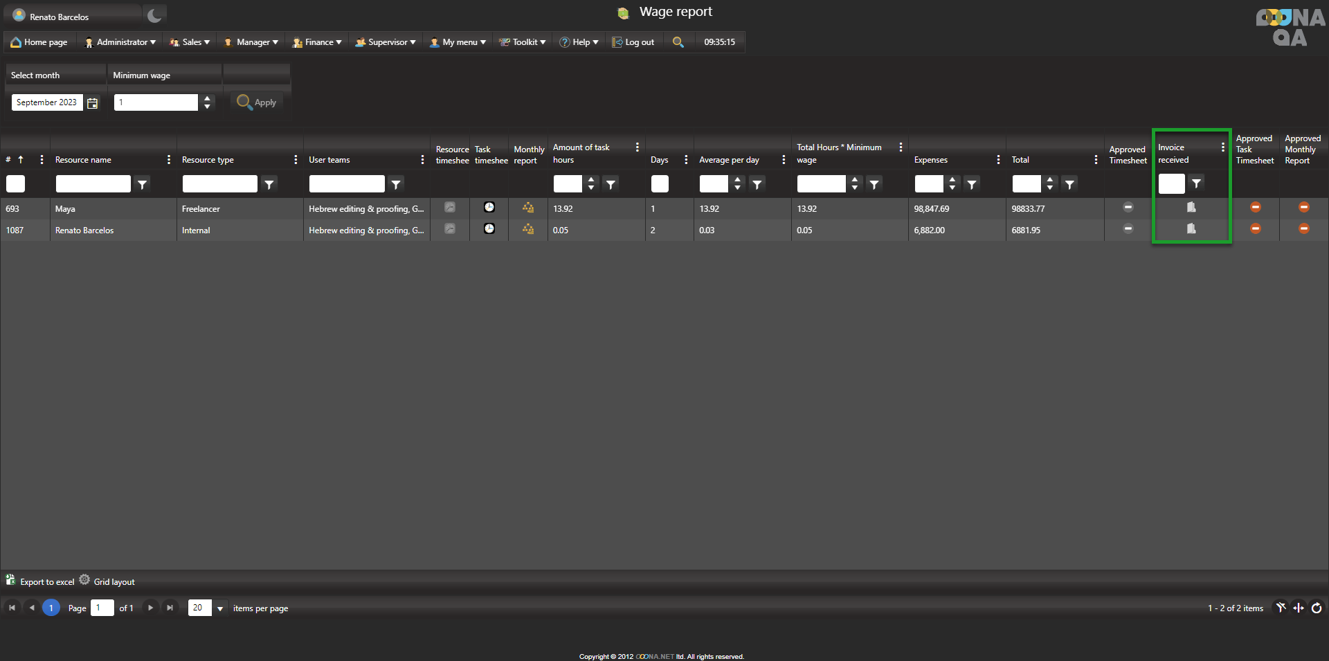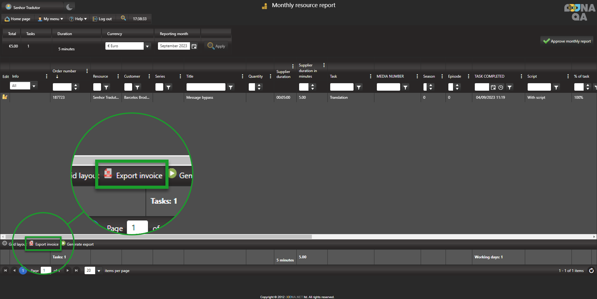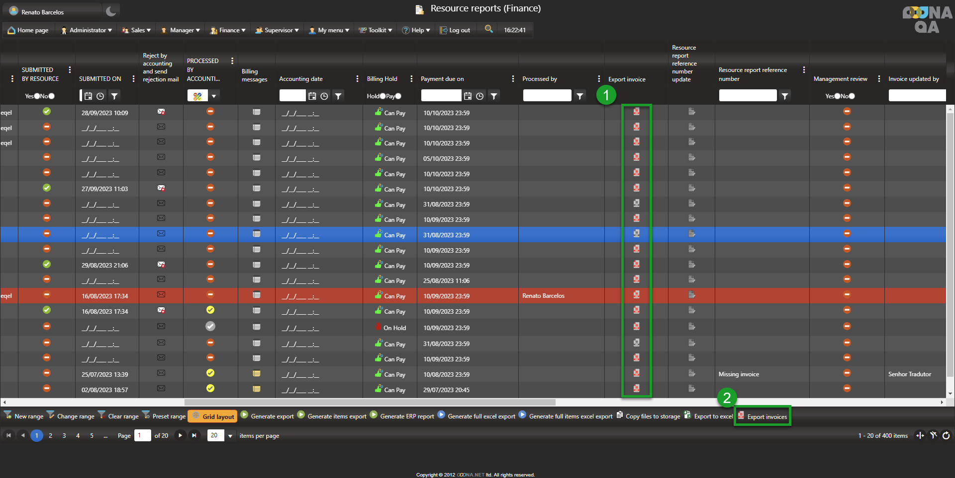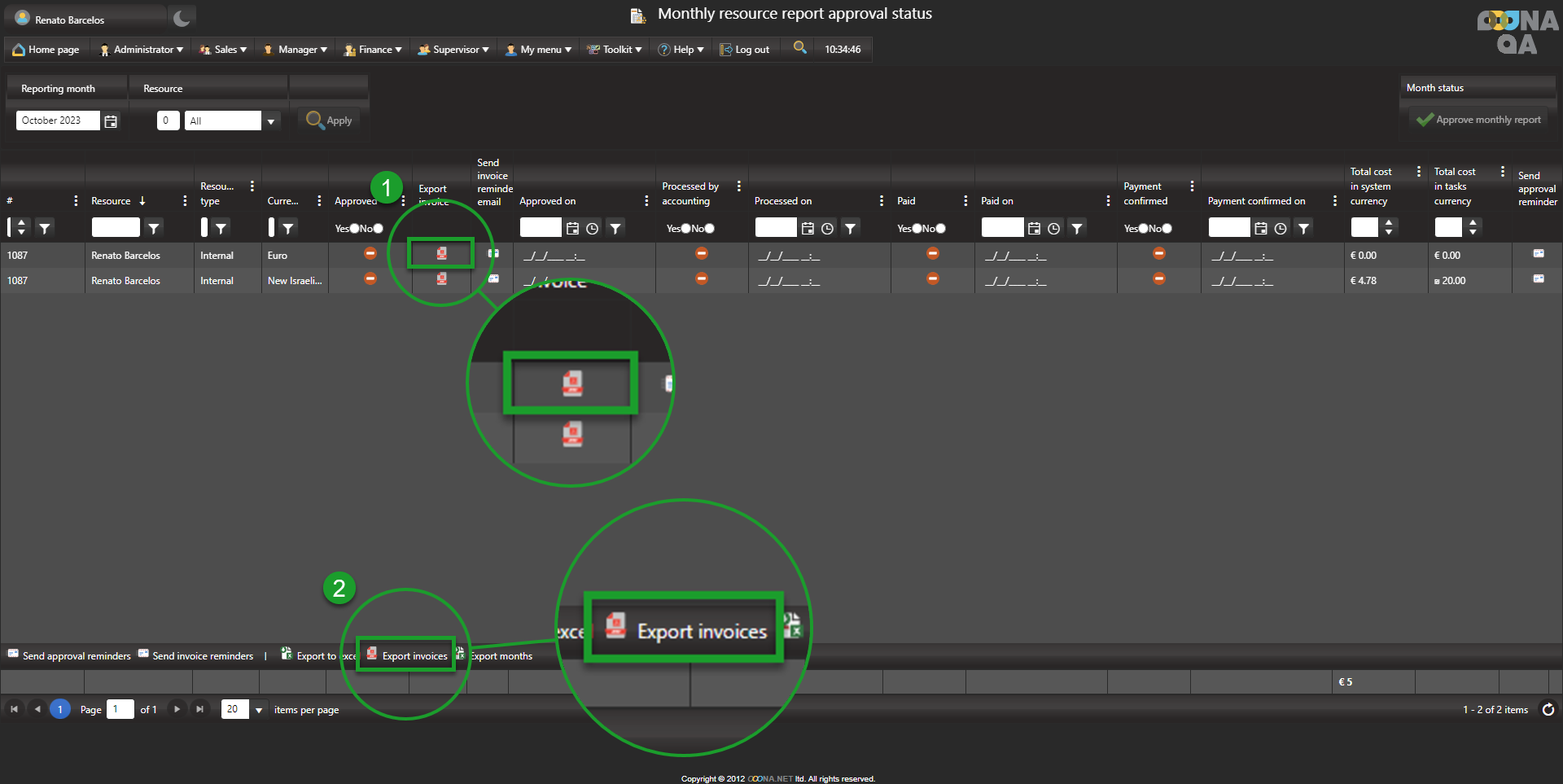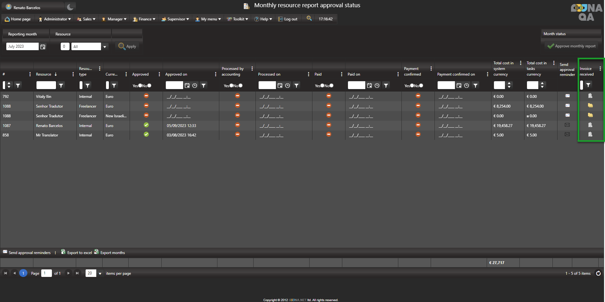 Additionally, invoices can be exported by users with the Finance role from Finance > Monthly resource report approval status.
