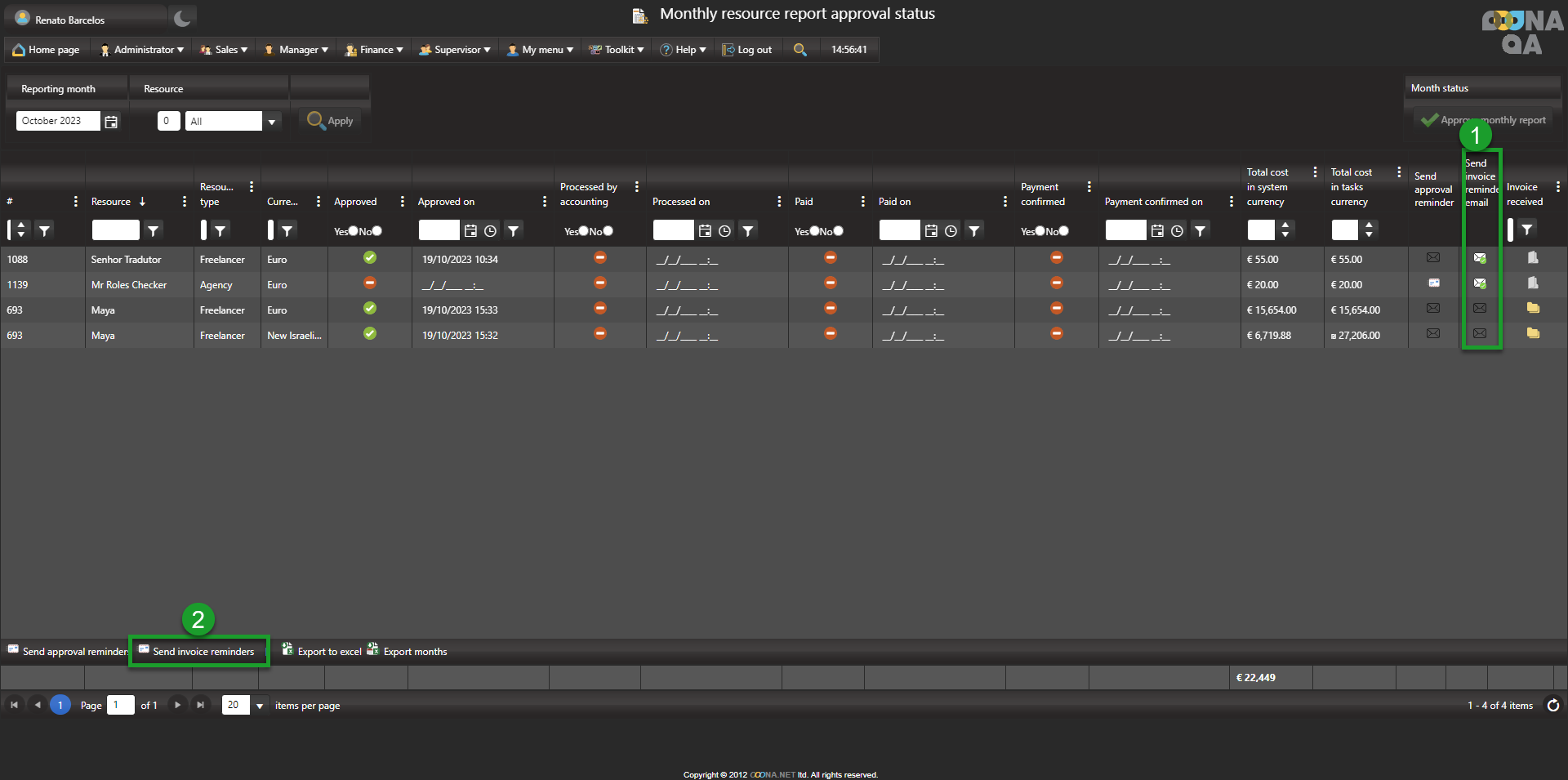A reminder to upload an invoice can be sent to a resource using the “Send invoice reminder email” column (1), or sent to all resources in the current page using the “Send invoice reminders” icon (2) on the bottom of the page.