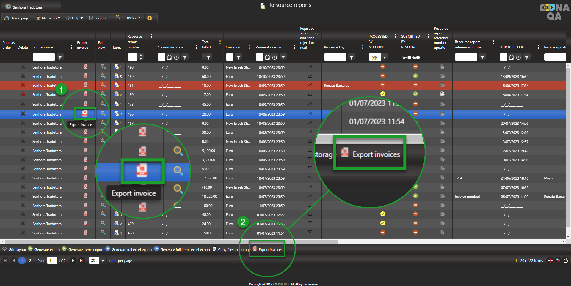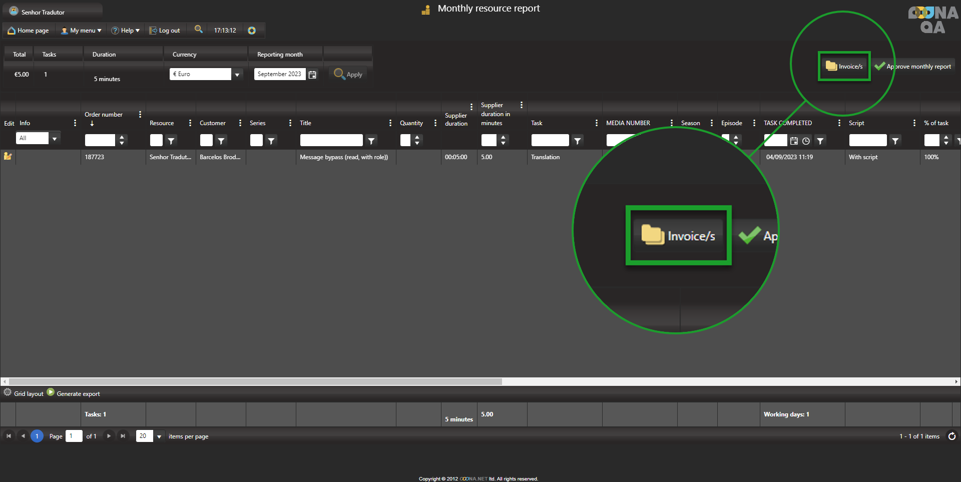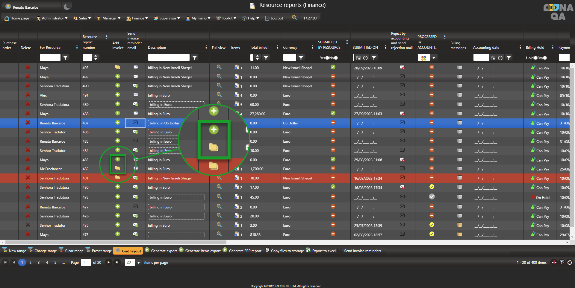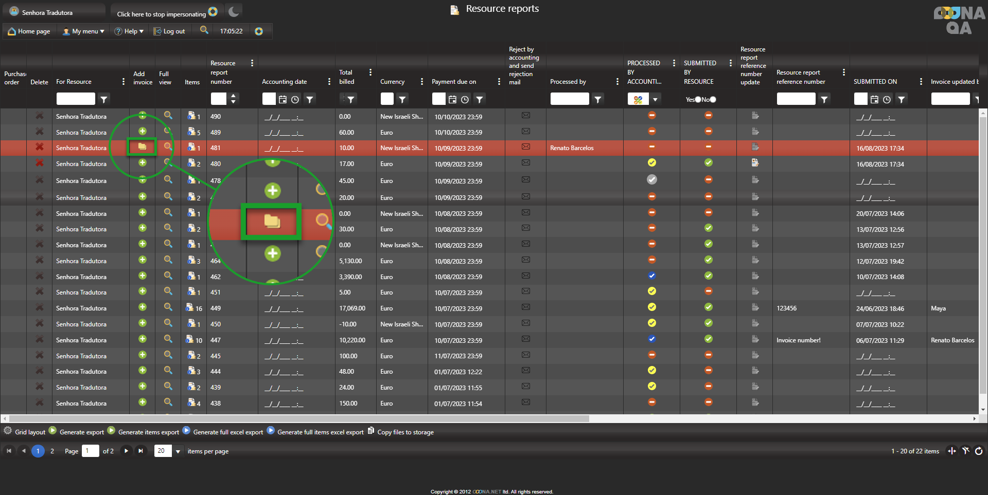 Basic resources can upload invoices from: My menu > Resource report, using the “Add invoice” column.