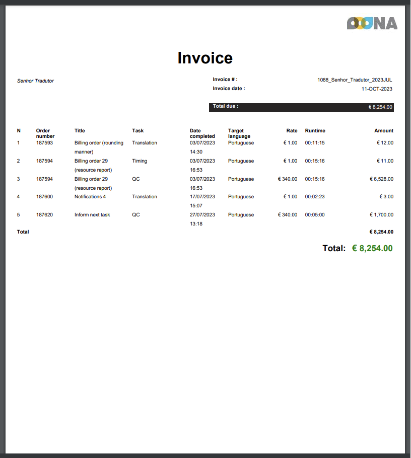 System-generated invoices are PDF files generated by the system that list all the tasks within a given monthly resource report or monthly report, and contain the relevant information for invoicing.
