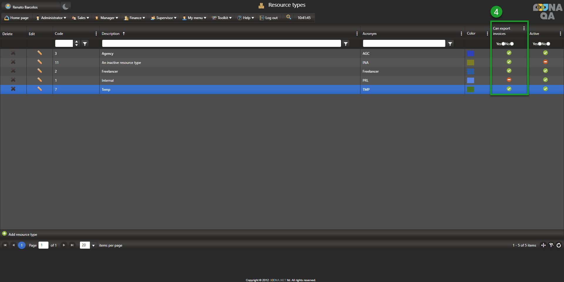 4. Select the resource types that should be able to export invoices from: Administrator > Tables > Resource types.