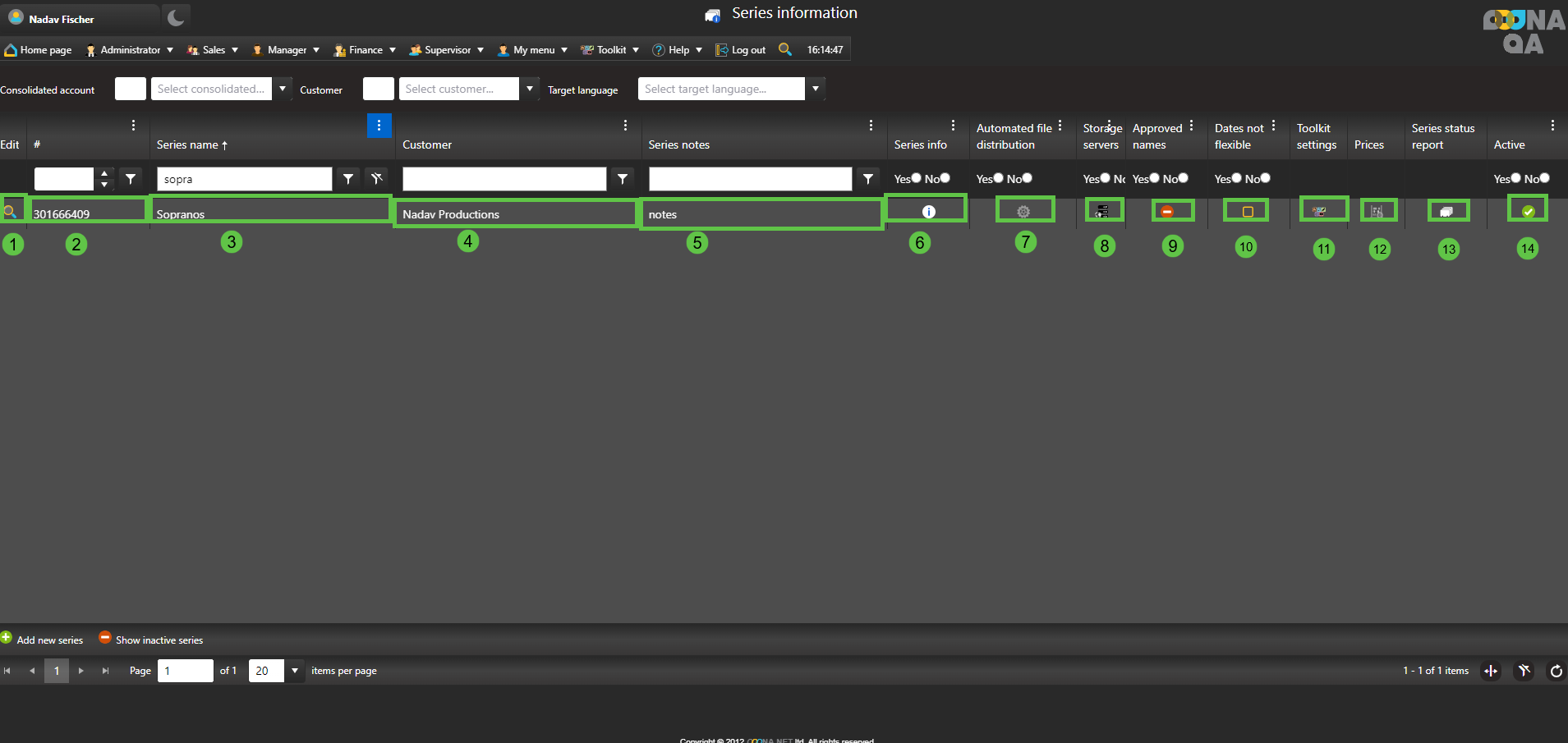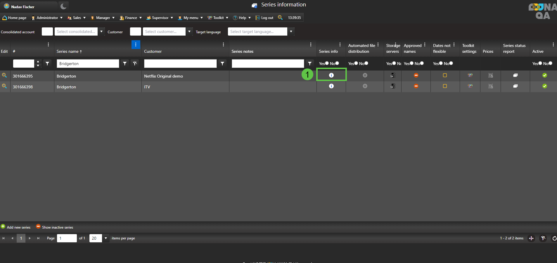 Accessing from the customer menu will filter the series displayed to that specific customer.