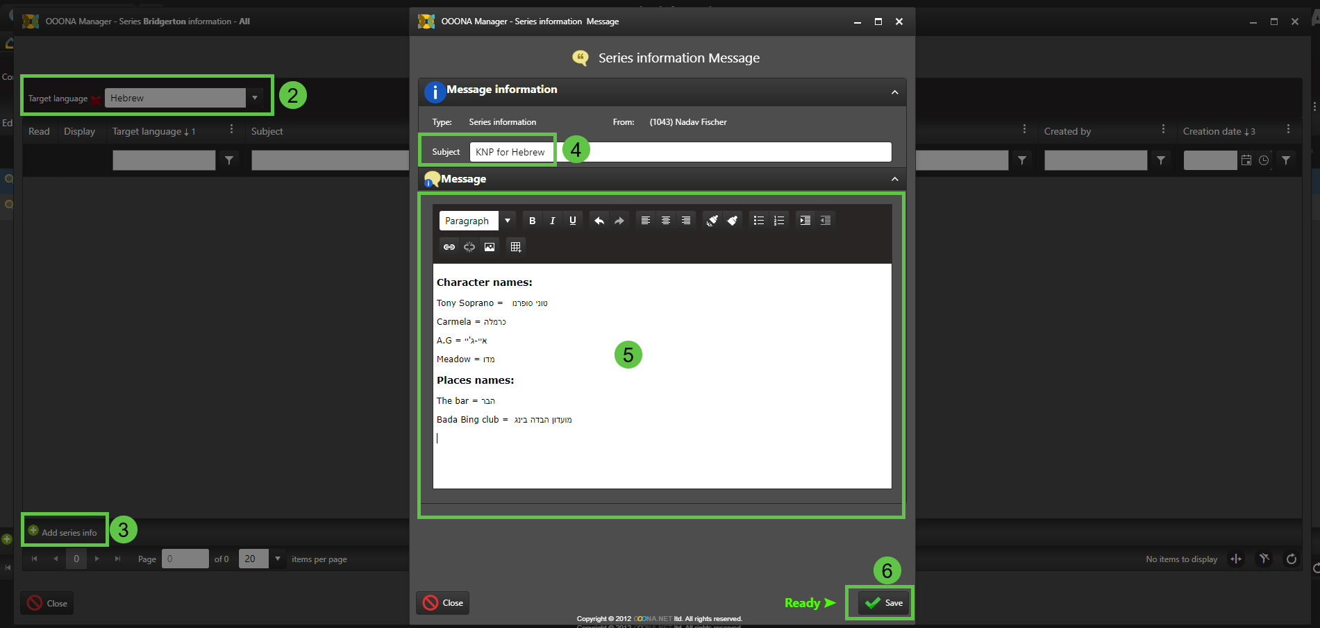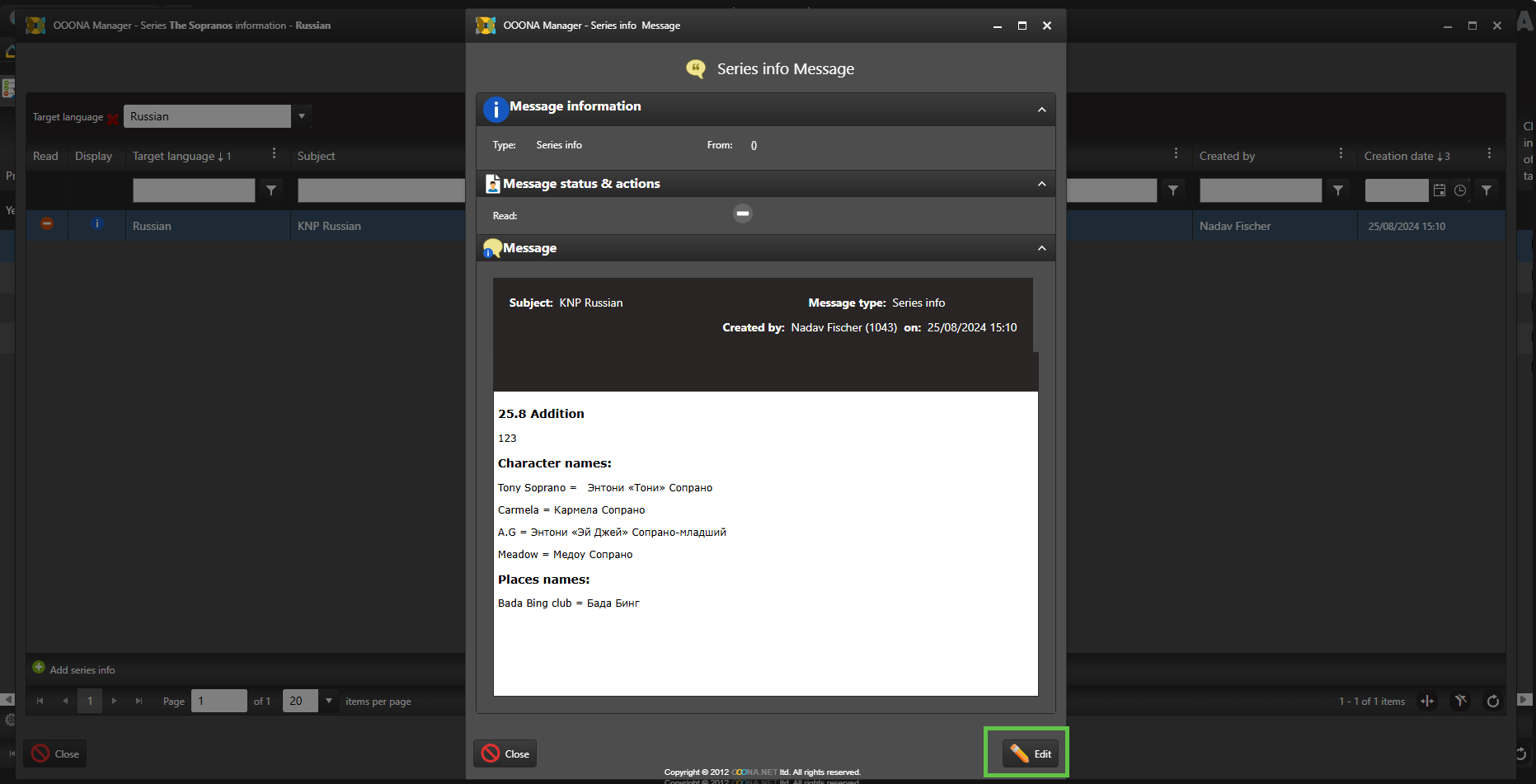 “Approved names” allows to enter an approved name for the series in different target languages, and also to specify if information such as episode title, episode number or season should be included in the body of the subtitles.