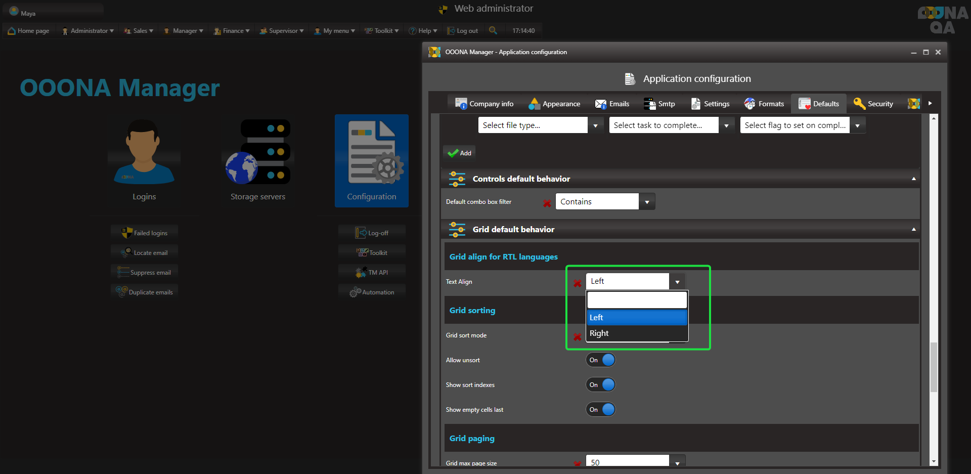 Setting text alignment in grids for Right-to-Left languages When grids contain text of Right-to-Left languages, the task alignment can be set in the system configuration. From: Administrator > Web Administrator Configuration > Defaults > Text align When set to Left alignment: When set to Right Alignment:
