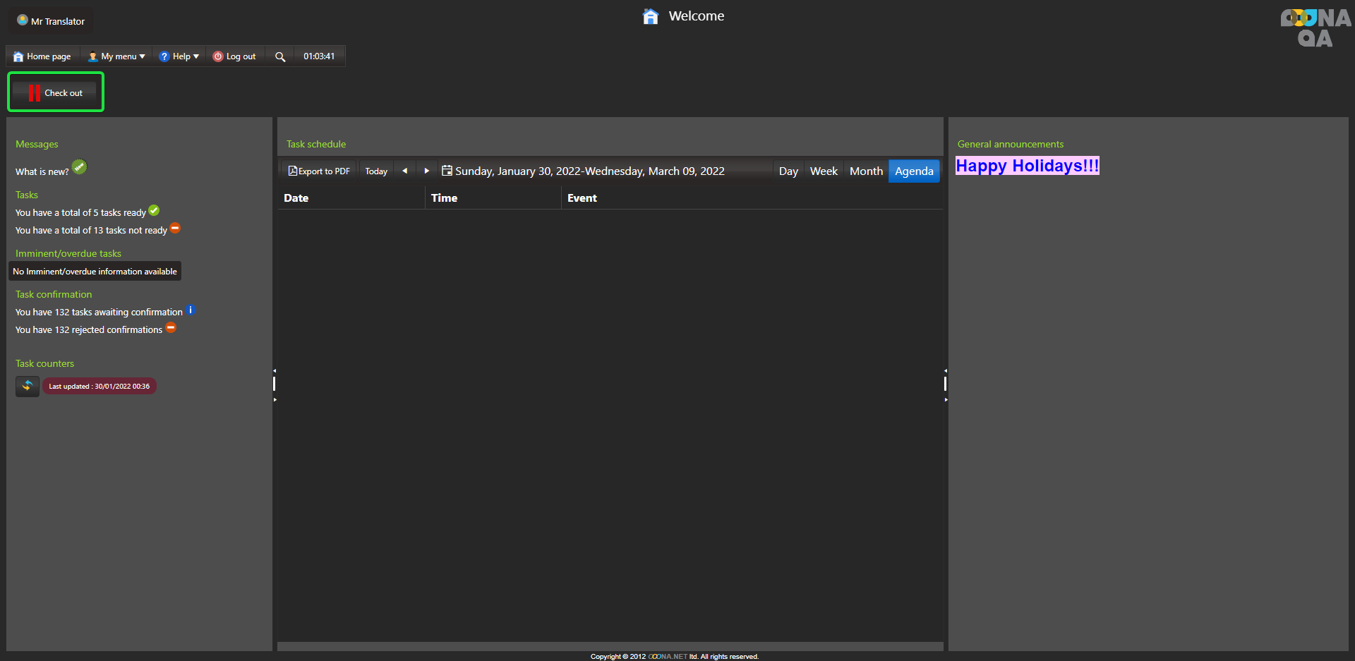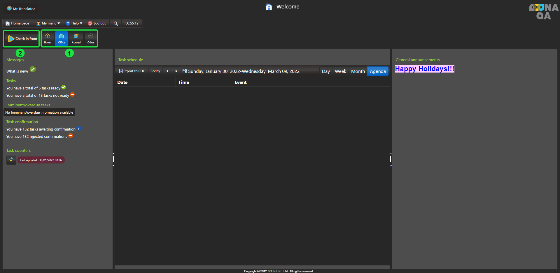System check-in/out can be activated in the system to have users check-in when they start working and check out at the end of the day.