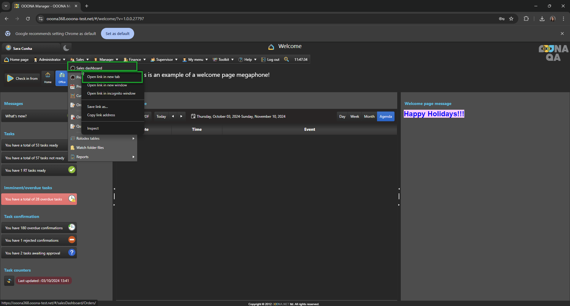 Before impersonating another user, be sure to close all tabs with your current user to avoid being kicked out of the OOONA Manager.
