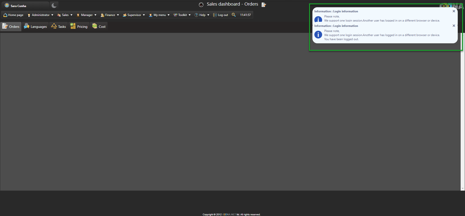 Using the same user login to access the OOONA Manager from different browsers or computers will result in your user being logged out.