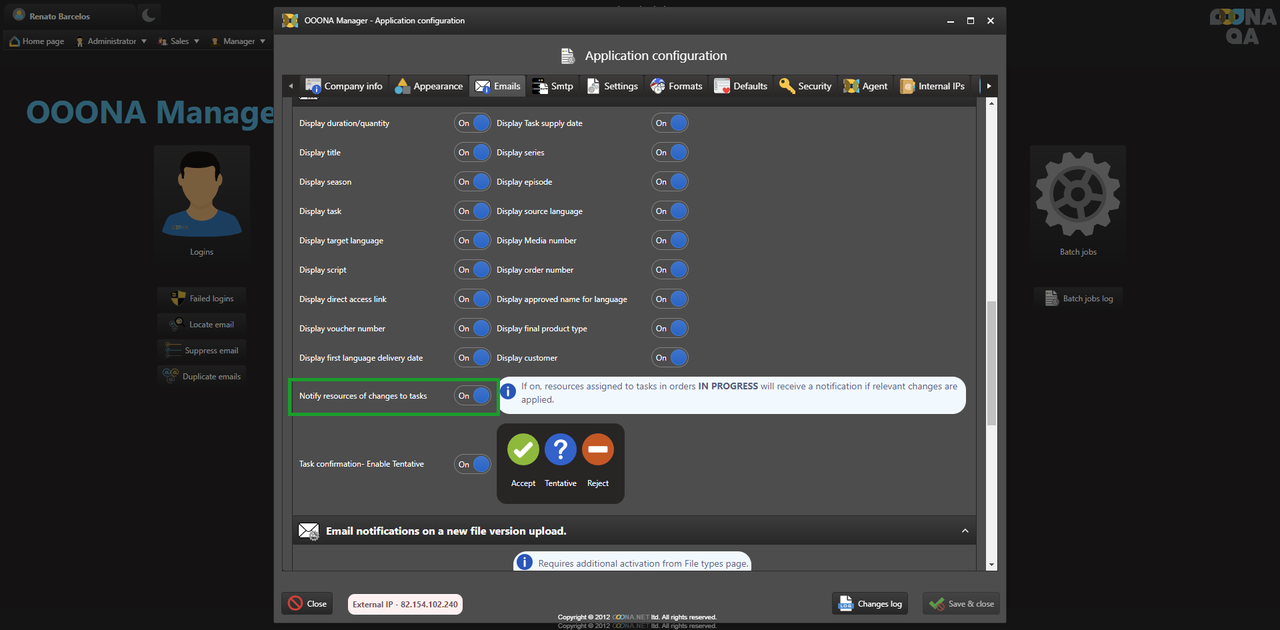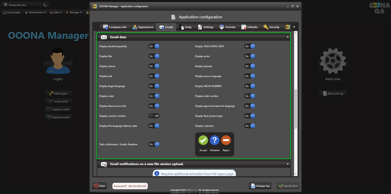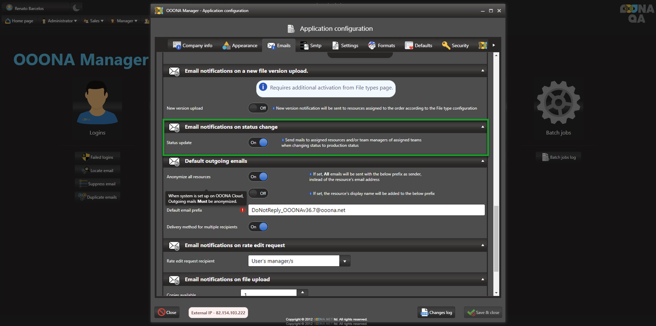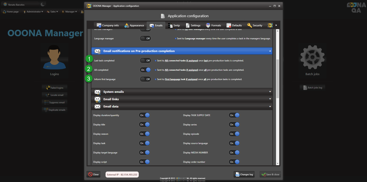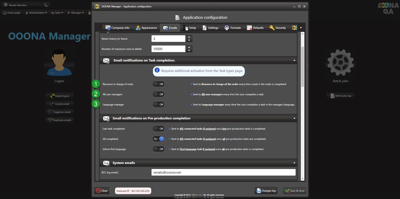 The system can send notifications to users upon completing the pre-production tasks, depending on the configuration used. This can be changed from Administrator > Web administrator > Application configuration > Emails: