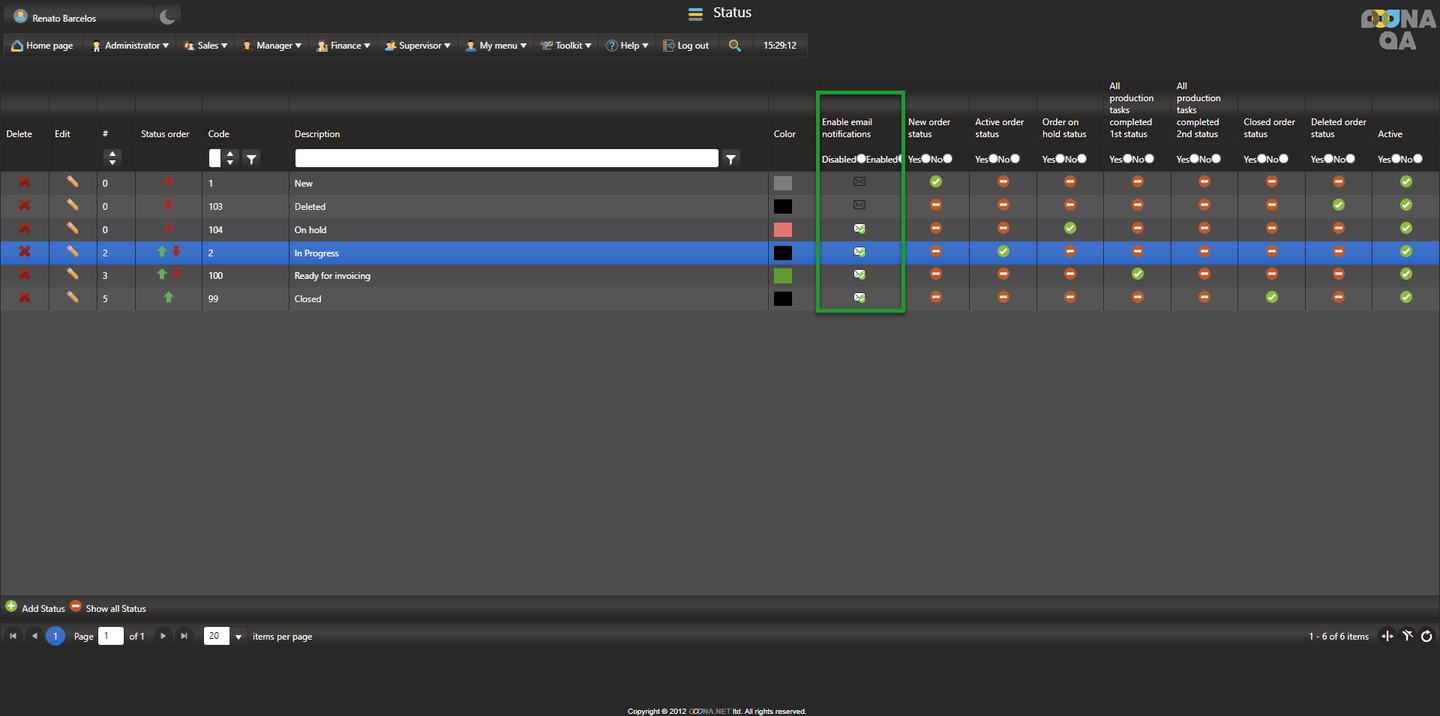 Within this page it is possible to set which status will trigger the automated notifications, by enabling or disabling them from the “Enable email notifications” column. By default, they’ll be off for “New” and “Deleted”.
