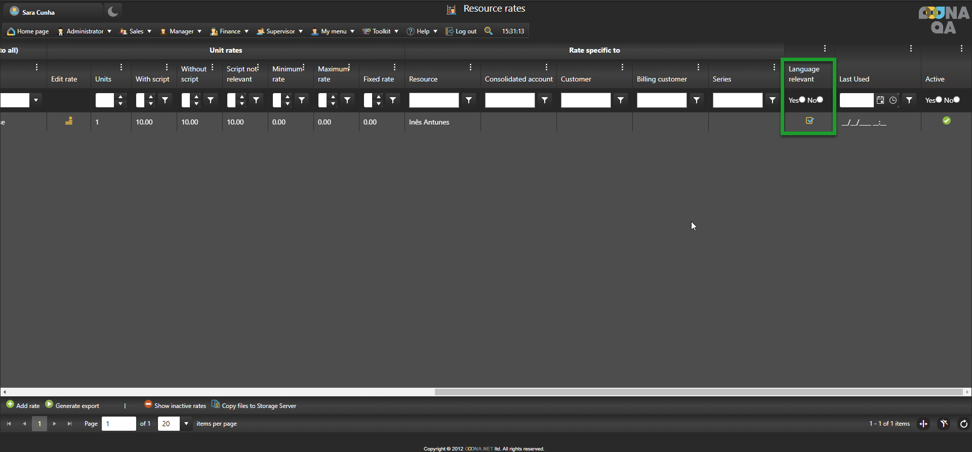 To create a resource rate with Unit reporting, go to Manager > Price lists & Workflow templates > Resource rates, click “Add rate” and a new editable row will be added to the grid.
